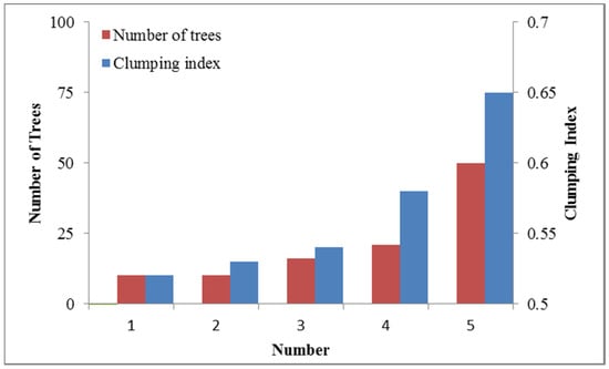 Number of trees and clumping index for each plot from the images in Figure 6.