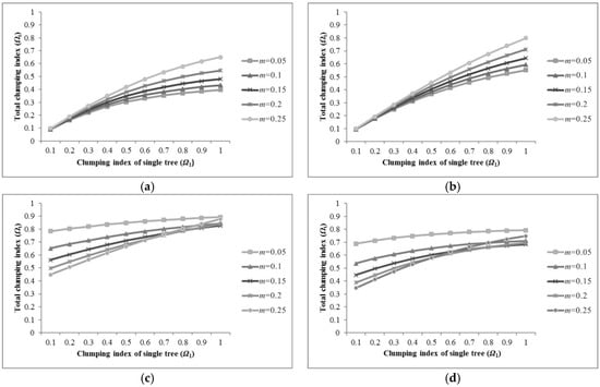 Pixel and single tree clumping index for different LAIs and canopy densities (m). (a,b) bare soil background; (c,d) grassland background. The clumping index and average true LAI of grass were assumed = 1 and 1.5, respectively; (a,c) average true LAI of a single tree = 3; (b,d) average true LAI of a single tree = 5.