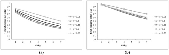Figure 9 shows that the LAI of a single tree () can also affect the pixel CI. The pixel CI decreases with increasing . There were also significant differences with different backgrounds. In the case of bare soil background, CI for smaller m was always lower for larger m, whereas for grassland background, the opposite trend occurs. From Figure 8 and Figure 9, the growth rate of would be slow and maximum of decreases with increasing . As increases, the leaves within the canopy become more aggregated, regardless of the background, but the CI for bare soil background decreases more rapidly.
