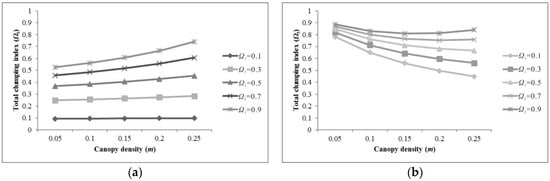 Pixel clumping index and canopy density for different single tree clumping indices when LAIa1 = 3. (a) Bare soil background; (b) Grassland background. The clumping index and average true LAI of grass were assumed = 1 and 1.5, respectively.