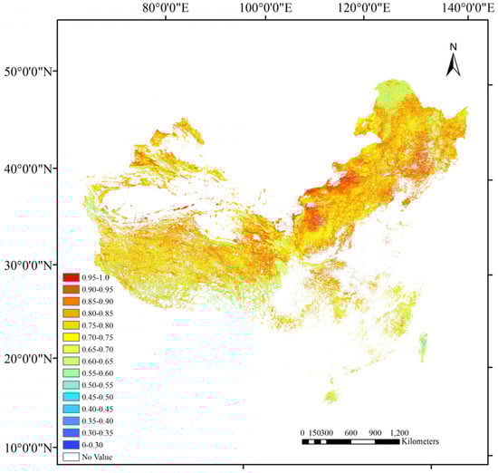 Clumping index products over China’s landmass at 500 m resolution (July 2010) retrieved by Zhu et al. [32].