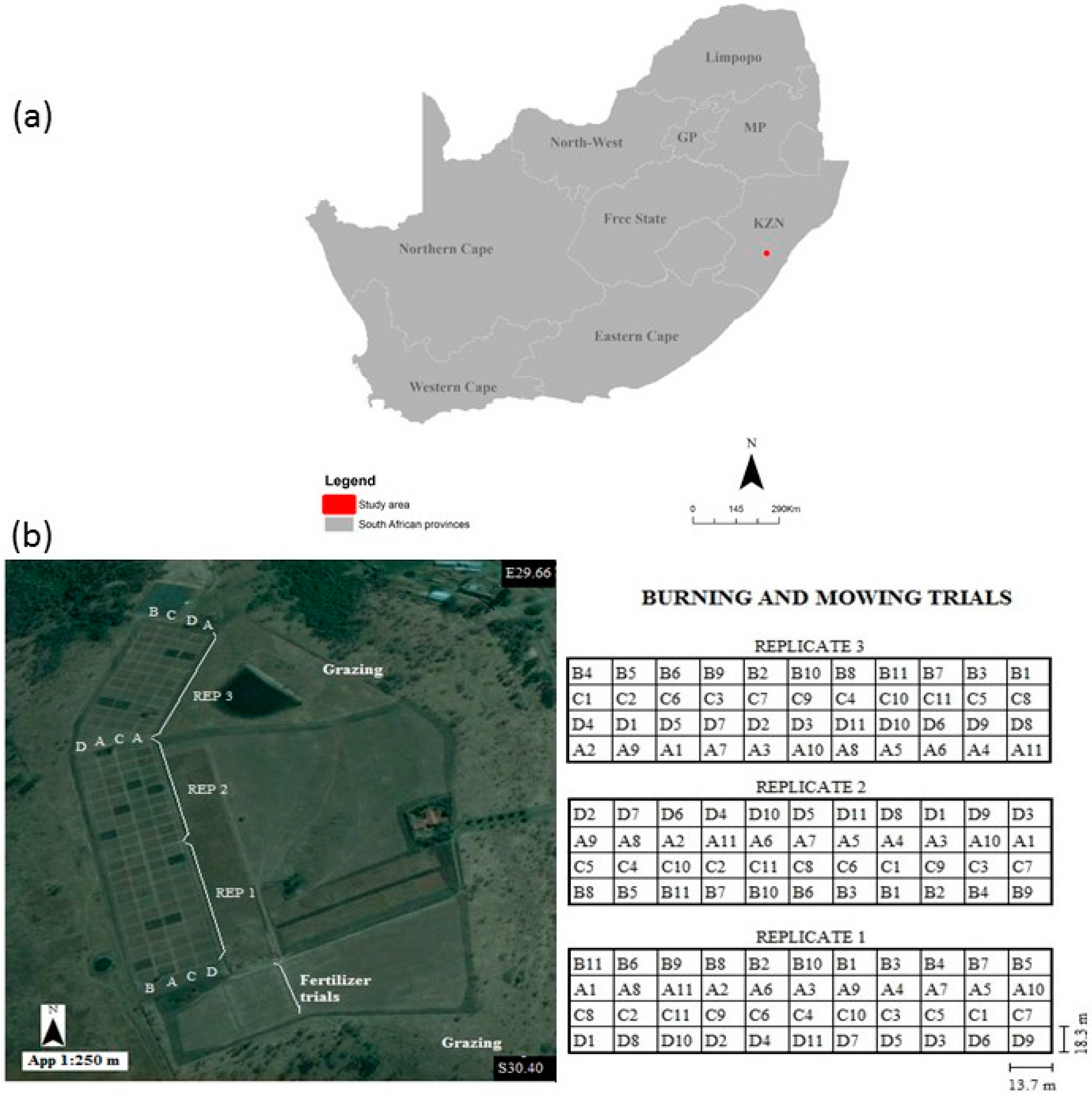 (a) Location of the grassland sites at Ukulinga University of KwaZulu-Natal experimental Farm, Pietermaritzburg, South Africa; (b) shows the experimental setup and design at Ukulinga research farm (Image source: Google Earth).