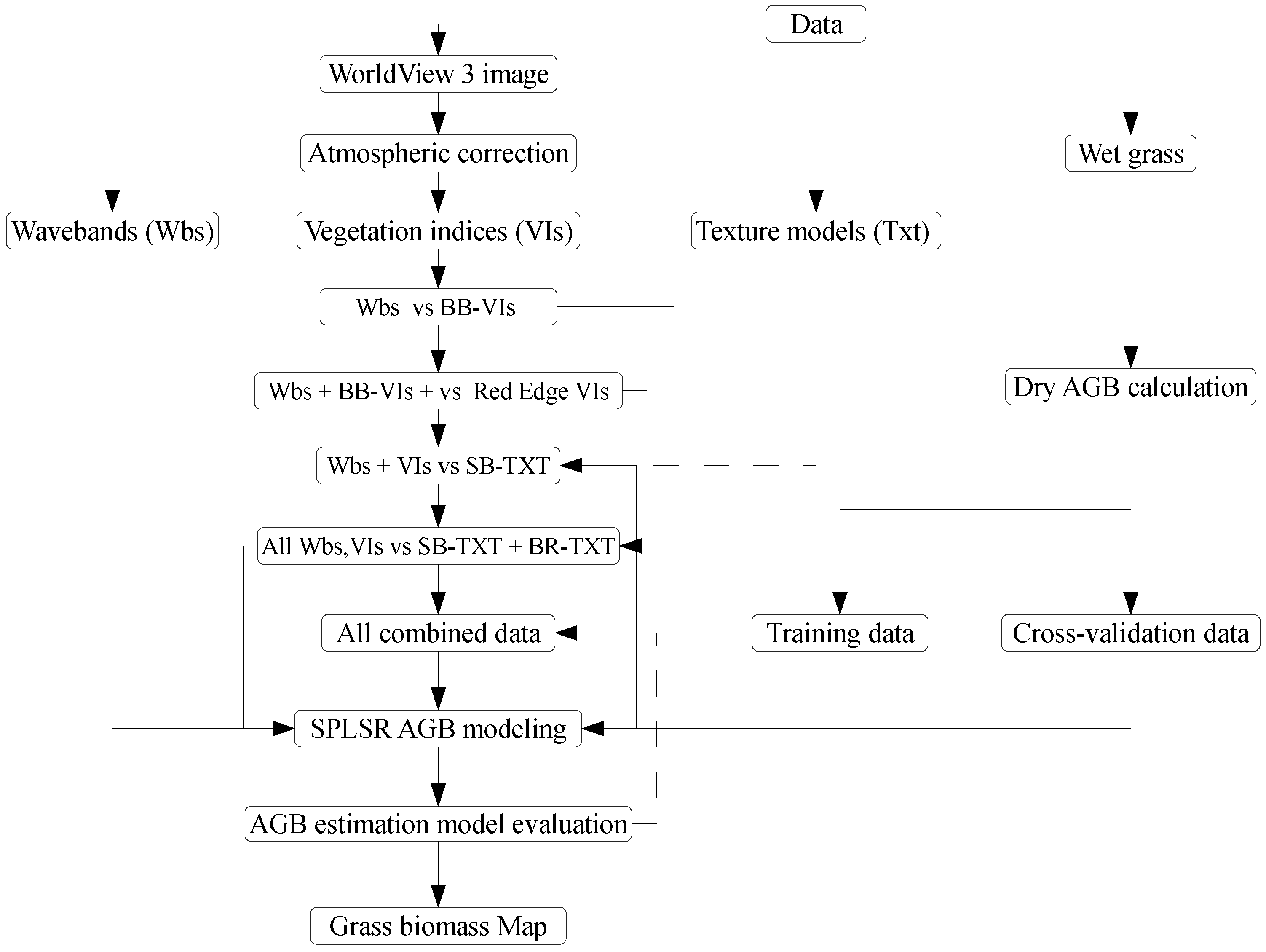 Flowchart illustrating stages in estimating above-ground (ABG) grass biomass in this study. Wbs represents WV-3 wavebands, VIs are vegetation indices, BB-VIs are broadband vegetation indices, SB-TXT represents single band texture models and BR-TXT represents band ratio texture models.