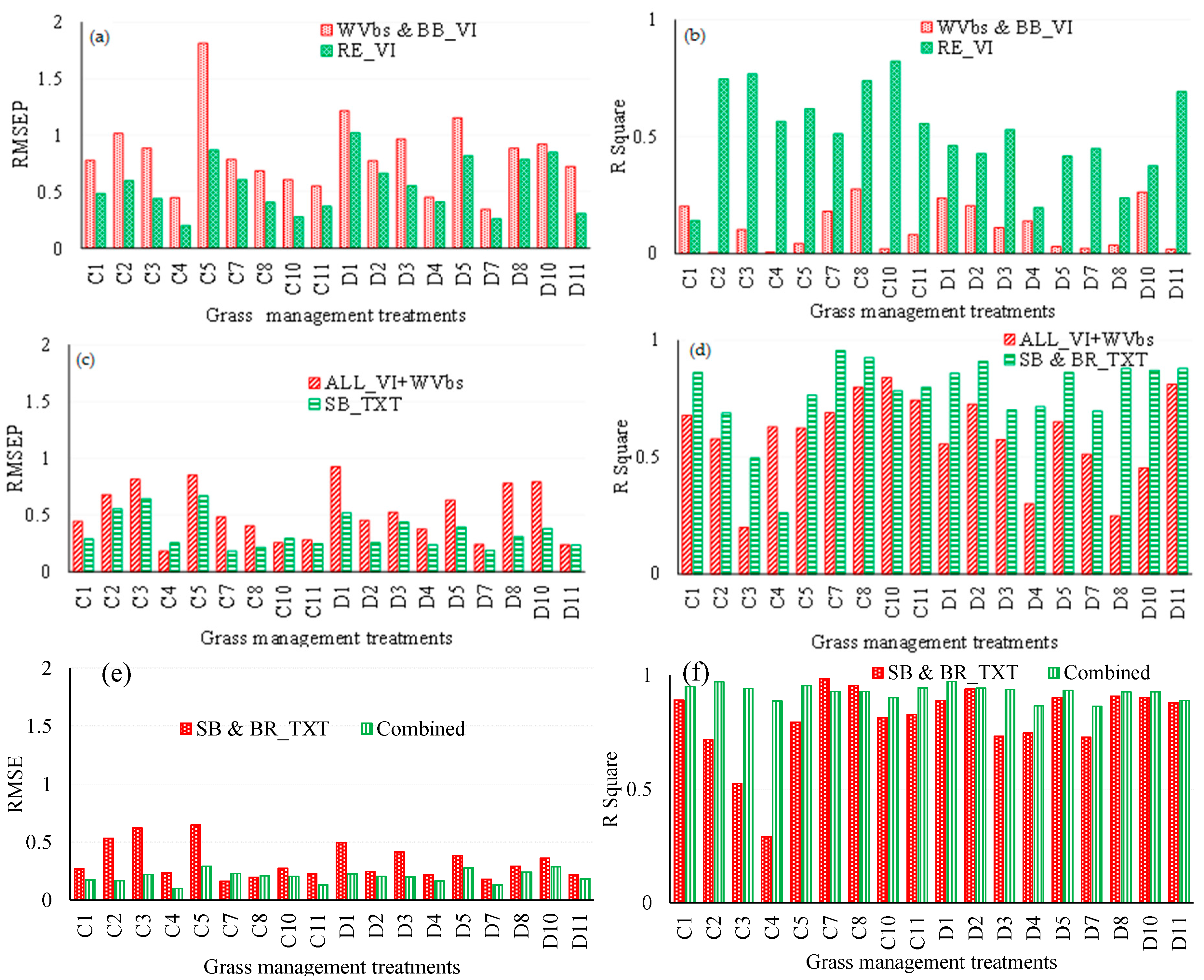 A comparison of estimation accuracies derived using different WV-3 satellite data and its derivatives. Root mean square error of prediction (RMSEP) and R squares obtained in comparing (a,b) WV-3 combined BB_VIs and red-edge vegetation (RE_VIs) (c,d), all VIs combined with WVbs and single-band texture models (SB_TXT) and (e,f) SB_TXT) and all data combined. C1–11 and D1–11 are illustrated in Table 1.