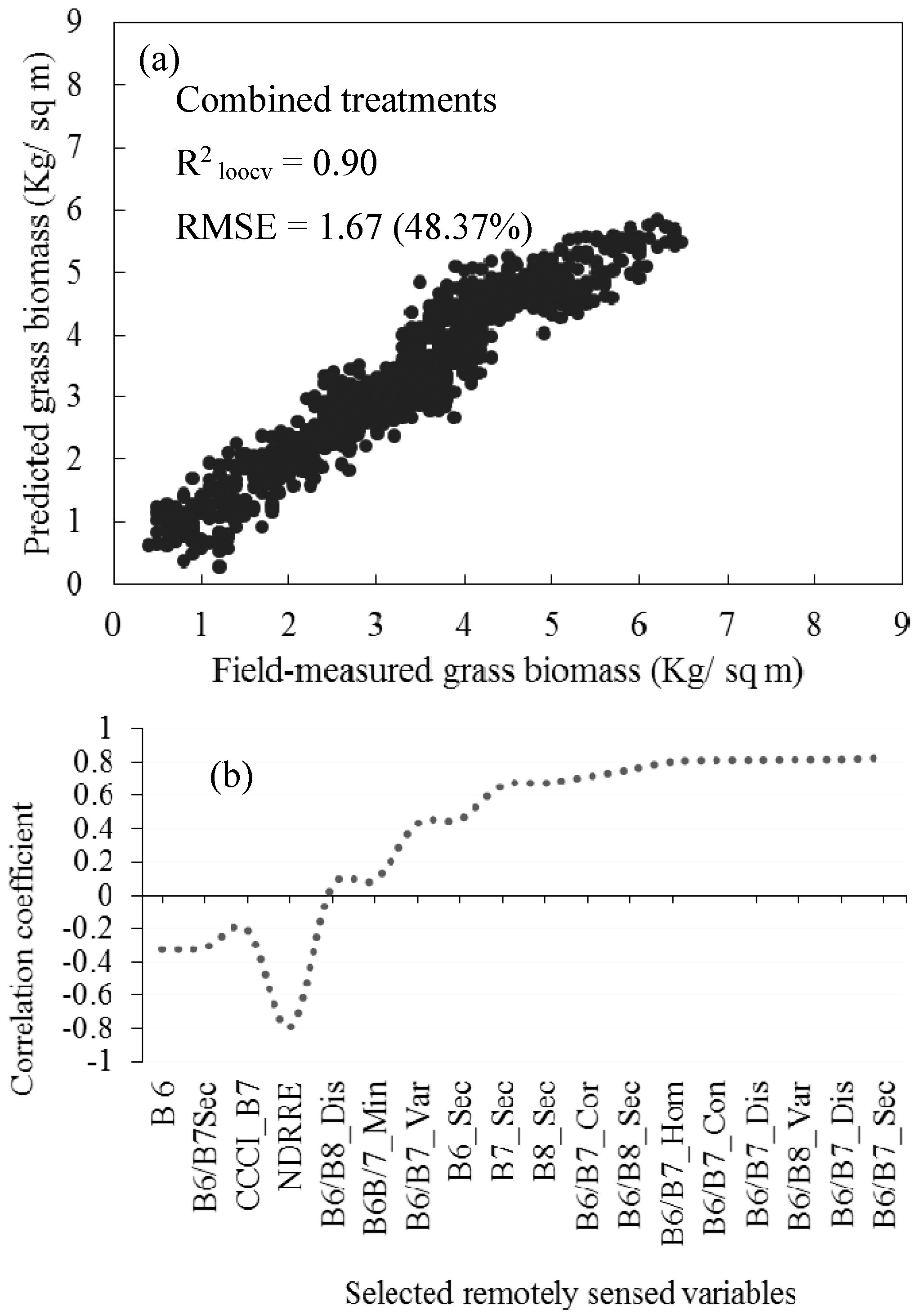 (a) Relationship between the field-measured and estimated grass above-ground biomass across all grass management treatments for validating sparse partial least regression (SPLSR) models, based on the leave-one-out cross-validation procedure. Note that the relative root mean square error is presented as a percentage; (b) illustrates the relationship between all the optimal variables and grass biomass across all treatments.