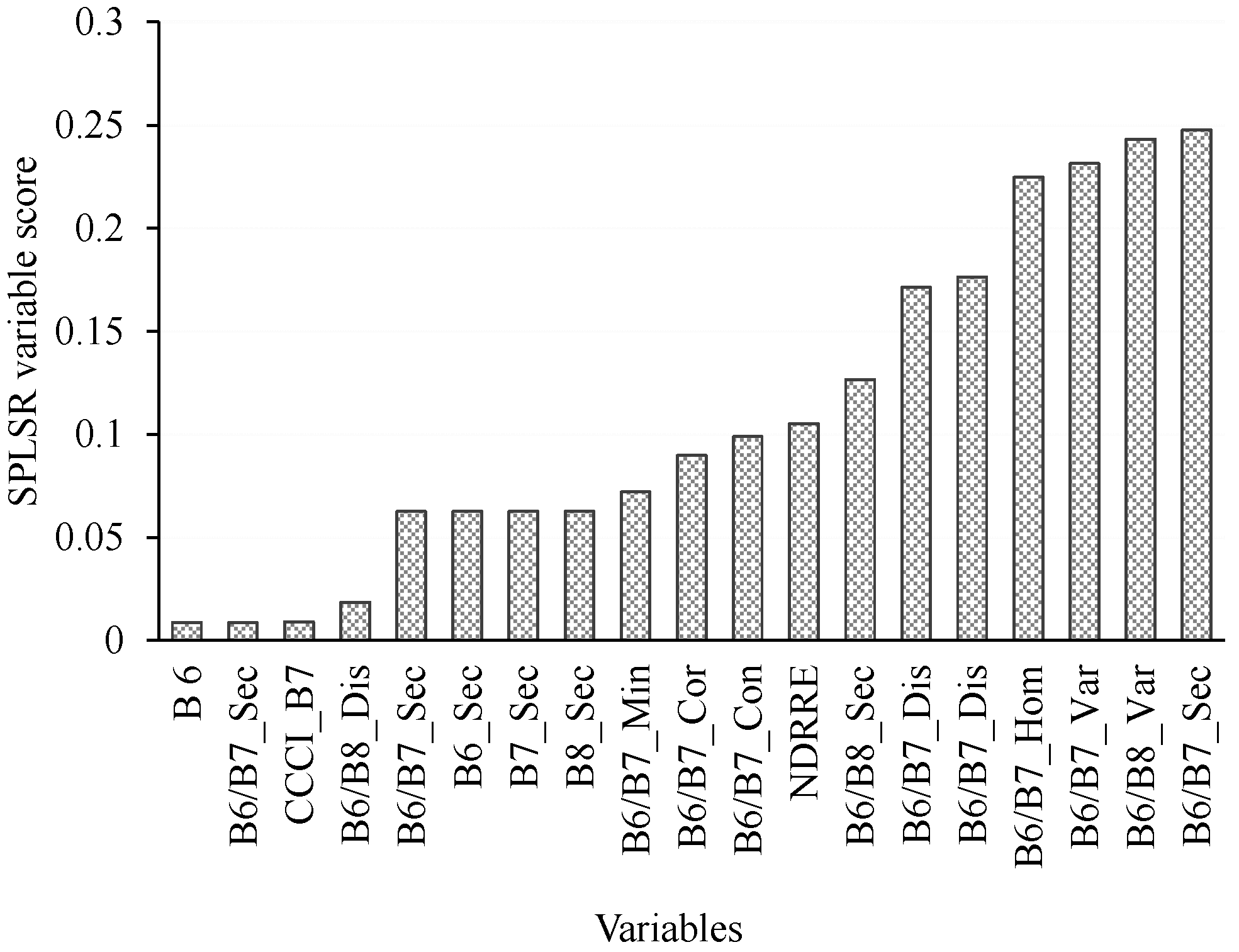 Best variables selected using SPLSR, in estimating above-ground grass biomass across different grassland management treatments. Note that on ‘B6/B7’ represents the ratio of WV-3 Bands 6 and 7 and NDRE is the normalized difference red-edge index.