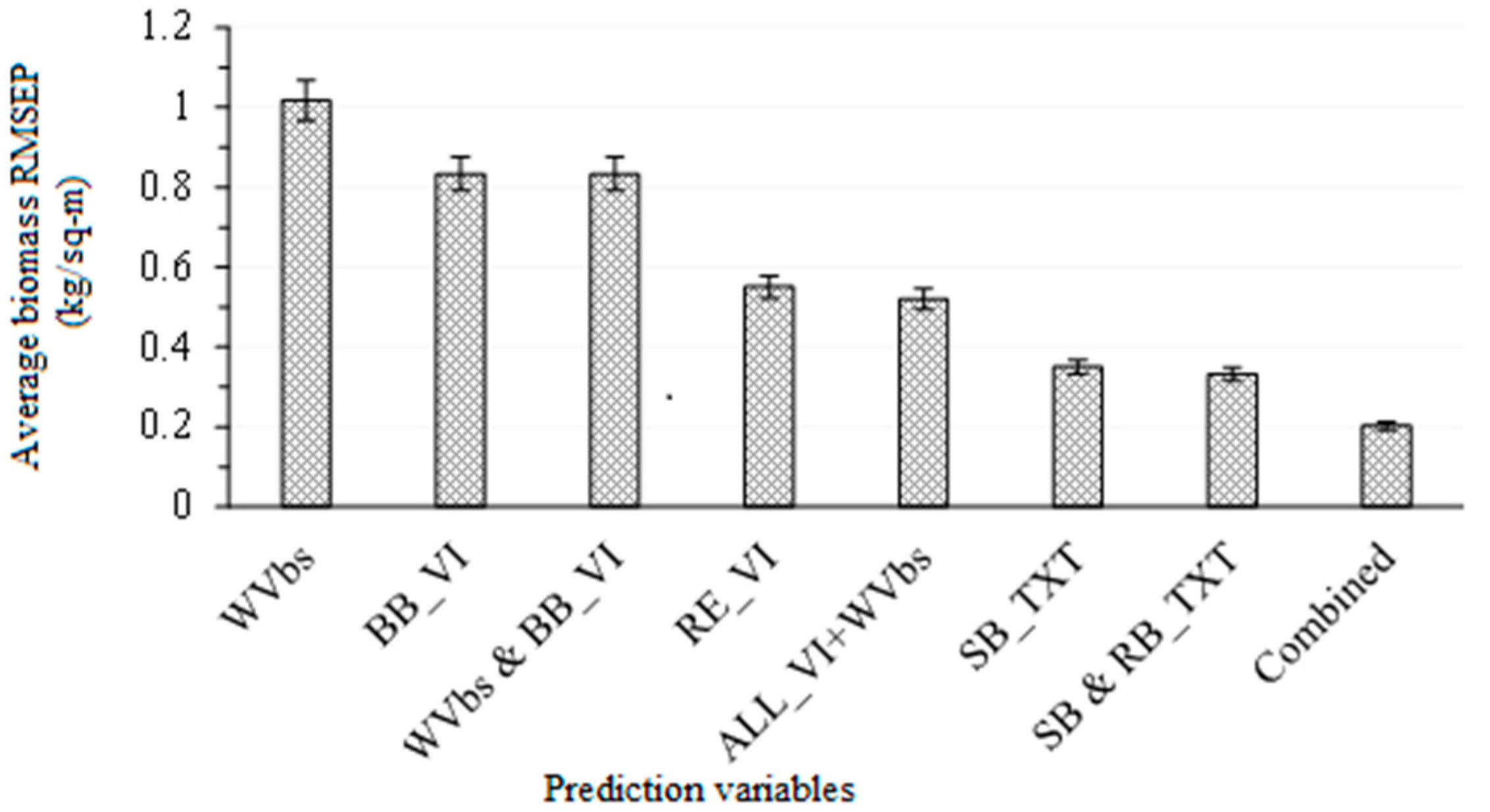 Figure 8 summarises the accuracies obtained, using single wavebands, broadband vegetation indices, red-edge vegetation indices, single-band and band-ratio texture models, in predicting ABGB across different levels of mowing and burning treatments. When single wavebands were used in estimating above-ground grass biomass, an average RMSEP of 1.02 kg/m2 was obtained. These variables had the highest RMSEP and were the least accurate predictors for estimating grass ABGB in this study. The accuracy of estimating ABGB slightly improved to an average RMSEP of 0.83, 1.02 kg/m2, when broadband vegetation indices were used. However, combining the broadband vegetation indices did not significantly improve the accuracy of ABGB estimation, as illustrated in Figure 8. The red-edge vegetation indices significantly improved the accuracy of ABGB estimation to average RMSEP: 0.55 kg/m2. The combination of red-edge vegetation indices with broadband vegetation indices, as well as single wavebands, did not significantly improve the accuracy of estimating grass ABGB in this study. When single-band grey level co-occurrence texture matrices were used the ABGB prediction accuracy significantly improved (average RMSEP: 0.35 kg/m2). In comparison, the combination of single-band and band-ratio texture models did not significantly improve the accuracy of estimating ABGB. When all variables were combined (red-edge and texture models), optimal accuracies (average RMSEP: 0.2 kg/m2) were obtained in this study.