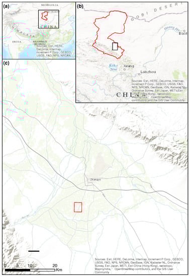The study area is located in the Heihe river basin, this area is a typical inland river basin in the northwest of China (Figure 1a,b). The second largest inland river basin of the country, it is located between 9724–10210E and 3741–4242N, and covers an area of approximately 130,000 km. Experiments conducted in the scope of the Watershed Allied Telemetry Experimental Research (WATER) project consisted in simultaneous airborne, satellite-borne and ground-based remote sensing measurements aiming at improving the observability, understanding and predictability of hydrological and ecological processes at catchment scale []. Airborne data used in this study were acquired over the Yingke oasis, located to the south of the Zhangye city (10025E, 3851N, 1519 m a.s.l.), which is a typical irrigated farmland (Figure 1c) where the primary crops are maize and wheat, with fields often separated by tree rows.