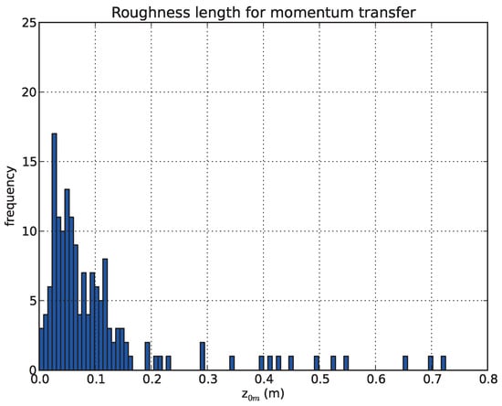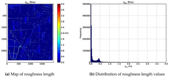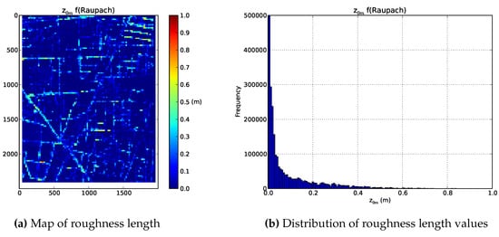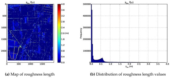 Figure 4 illustrates values obtained by the application of this simple formula (Equation (22)). The range of values is limited to 4 m in Figure 4a since the occurrence of higher values is marginal. Also the frequency range in Figure 4b is limited to 500,000 in order to show the distribution of values. As roughness length is simply proportional to the vegetation height, lowest values (from 0 to 0.05 m) are retrieved for the crops (i.e., low vegetation) and highest ones are found for the trees (from 1 to 4 m). Buildings and some crops show generally mean values of roughness length. Displacement height is retrieved in the same manner as in Equation (20).