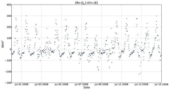 where is the net radiation flux, H is the sensible heat flux, is the latent heat flux and is the soil heat flux. The sign convention in Equation (1) is that is considered positive when directed towards the land surface, while H, and are considered positive when directed away from the land surface. For the sake of simplicity, all flux densities will be called fluxes, and the unit is W/m.