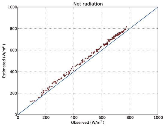 Scatter plot of measured and estimated net radiation from the 30 June to the 14 July 2008 at the Yingke station. RMSE = 32 W/m.