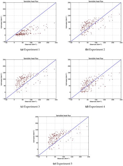Scatter plots of measured and estimated sensible heat flux for (a) experiment 1, (b) experiment 2, (c) experiment 3, (d) experiment 4, (e) experiment 5.