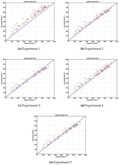 Scatter plots of measured and estimated latent heat flux for (a) experiment 1, (b) experiment 2, (c) experiment 3, (d) experiment 4, (e) experiment 5.