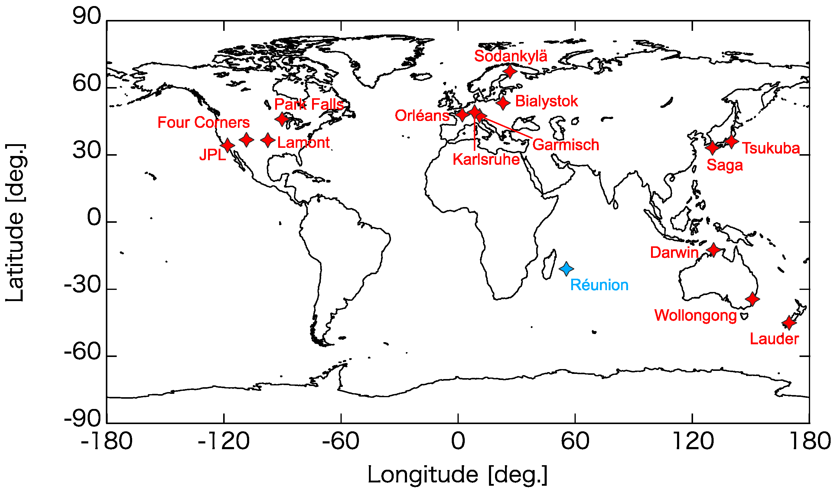 Total Carbon Column Observing Network (TCCON) sites used in the present study. Red stars indicate the sites used for comparisons with the Thermal And Near-infrared Sensor for carbon Observation-Fourier Transform Spectrometer (TANSO-FTS) thermal infrared (TIR) and short-wavelength infrared (SWIR) column averaged dry-air mole fraction of water vapor (XH2O) data, and the blue star is the Réunion site used only for comparison with the TANSO-FTS TIR data.