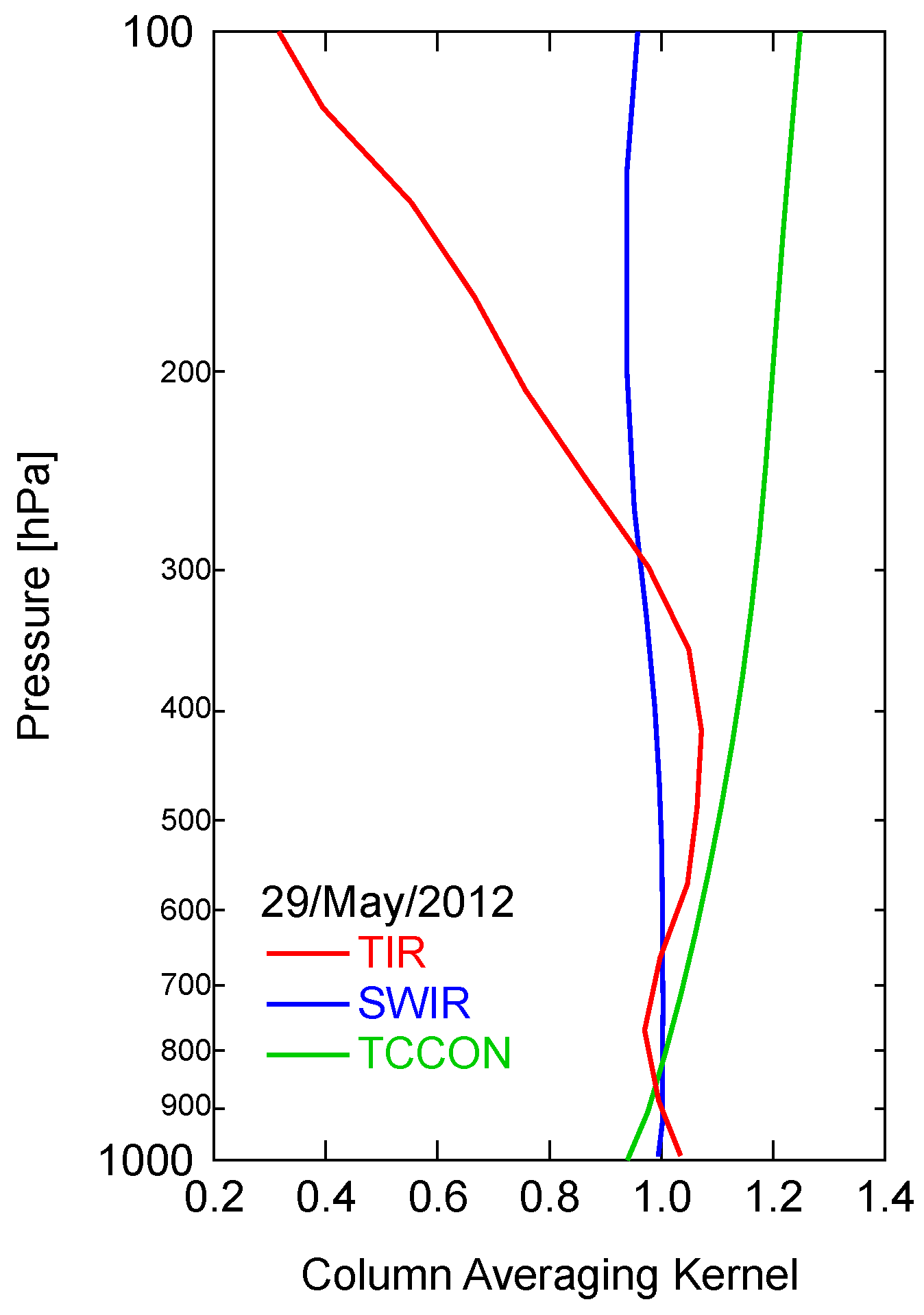 Column averaging kernels corresponding to the TANSO-FTS TIR, TANSO-FTS SWIR, and ground-based FTS measurements recorded at Saga on 29 May 2012.
