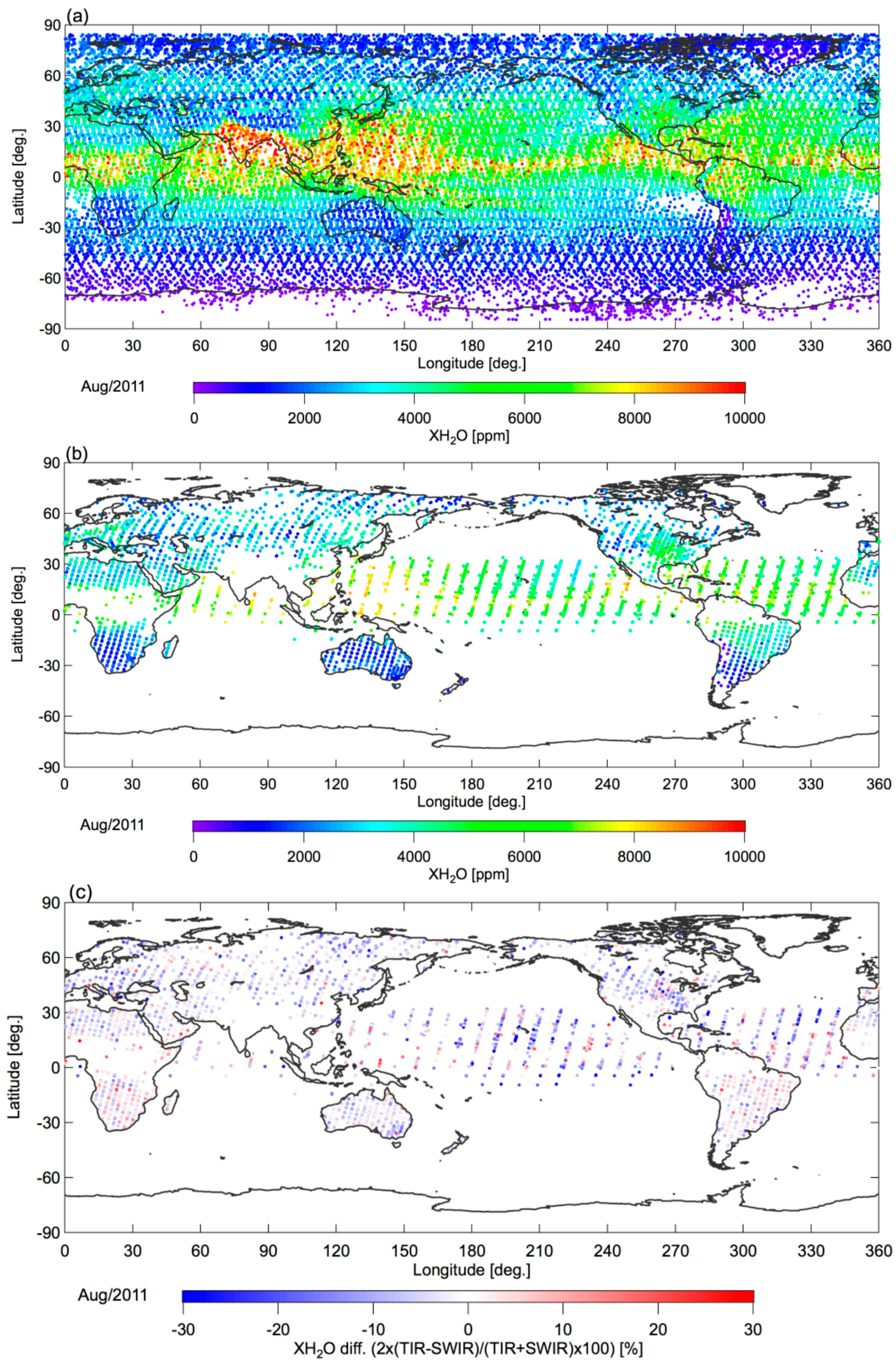 Global distribution of the (a) TANSO-FTS TIR and (b) TANSO-FTS SWIR XH2O data in August 2011; (c) The colors of the dots represent the difference between the TANSO-FTS TIR and SWIR XH2O data, which are coincident in space and time.