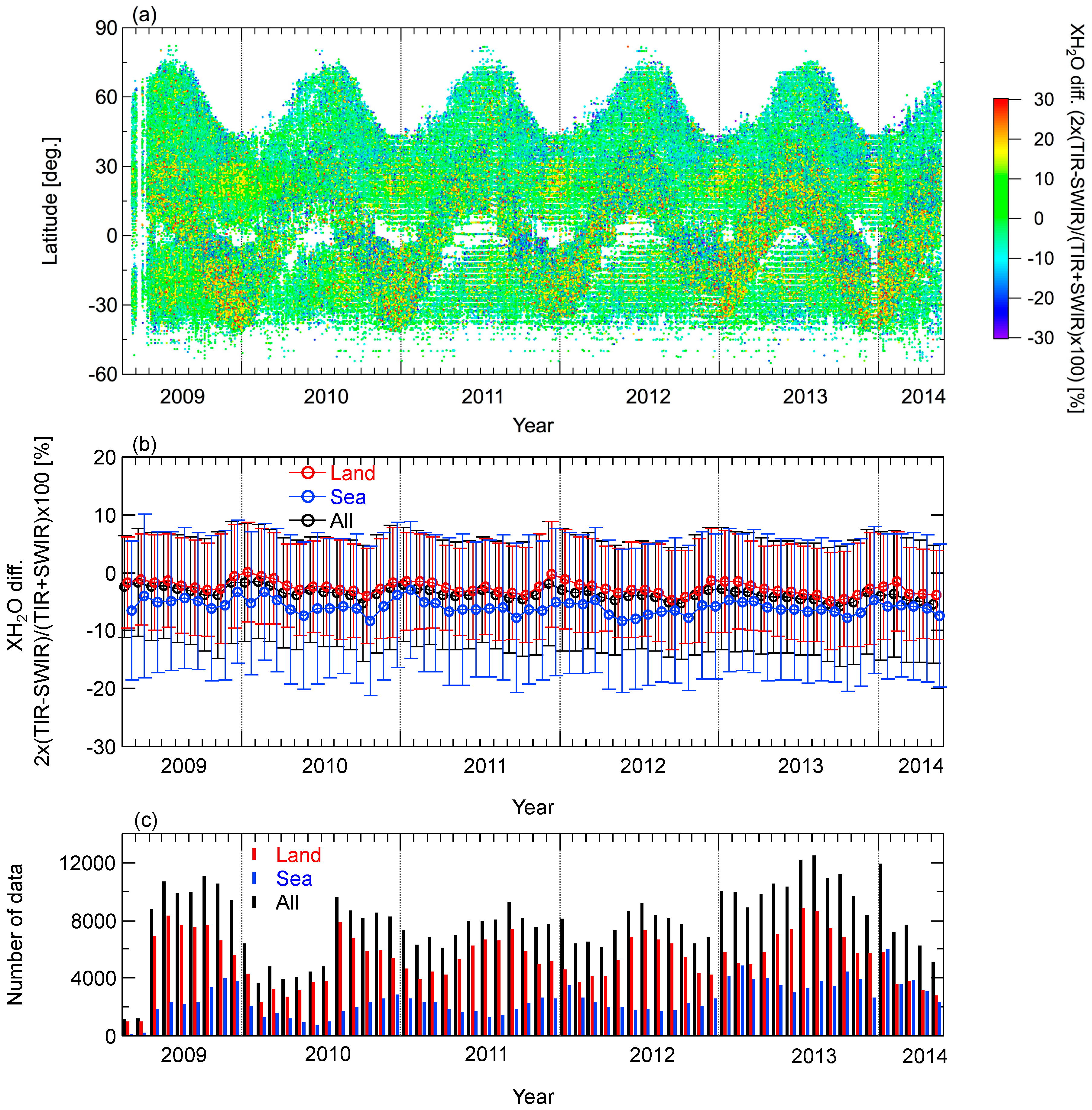 (a) Time-latitude cross-section of the difference between the TANSO-FTS TIR and SWIR XH2O data; (b) Monthly mean differences and standard deviations between the TANSO-FTS TIR and SWIR XH2O data for land (red), ocean (blue), and land + ocean (black) scenes; (c) Amounts of data used for comparisons between the TANSO-FTS TIR and SWIR XH2O data for land (red), ocean (blue), and land + ocean (black) scenes.