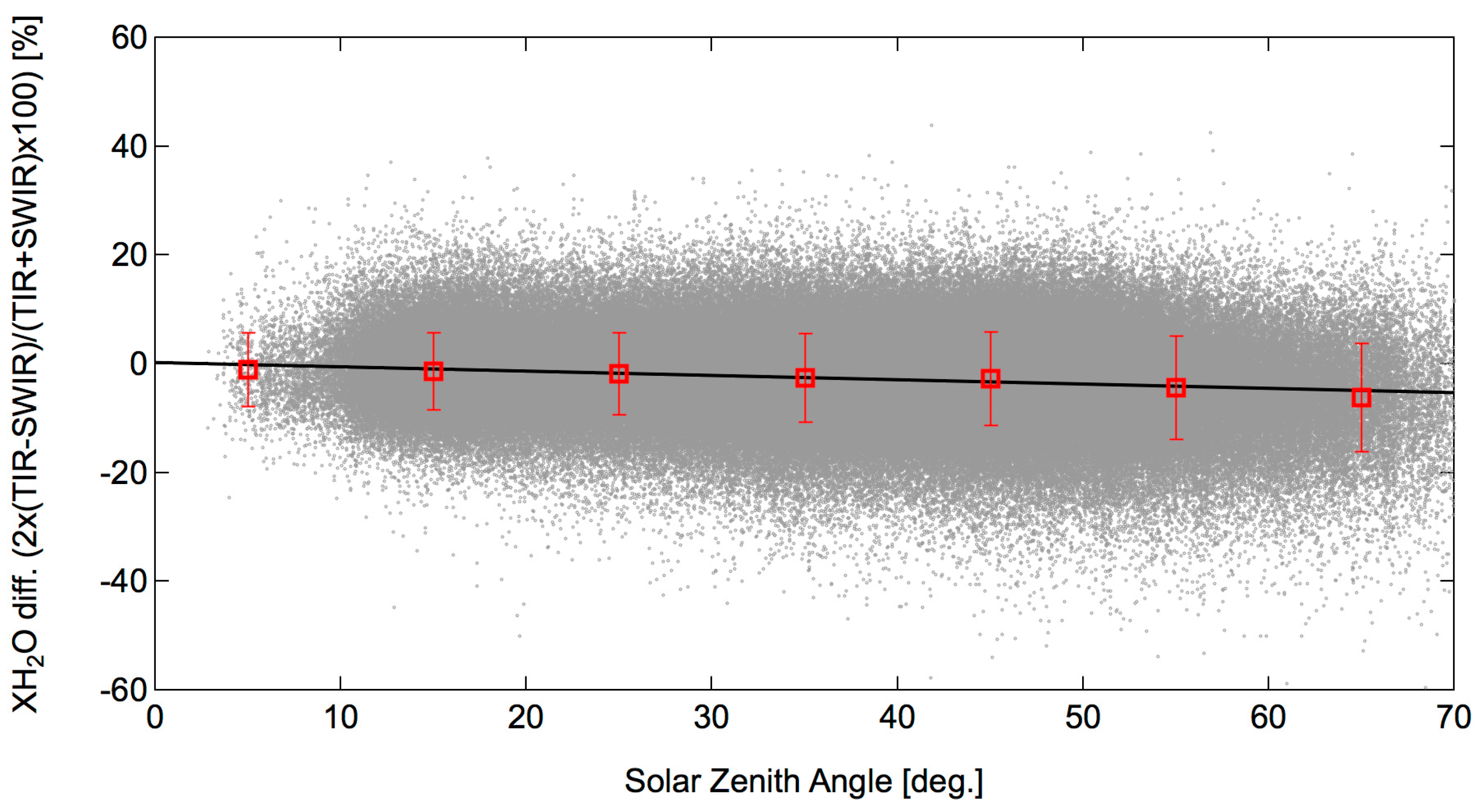 The differences between the TANSO-FTS TIR and SWIR XH2O data above land with respect to solar zenith angle (SZA). The solid line denotes linear fit. The mean biases and standard deviations per 10° bins are also shown.