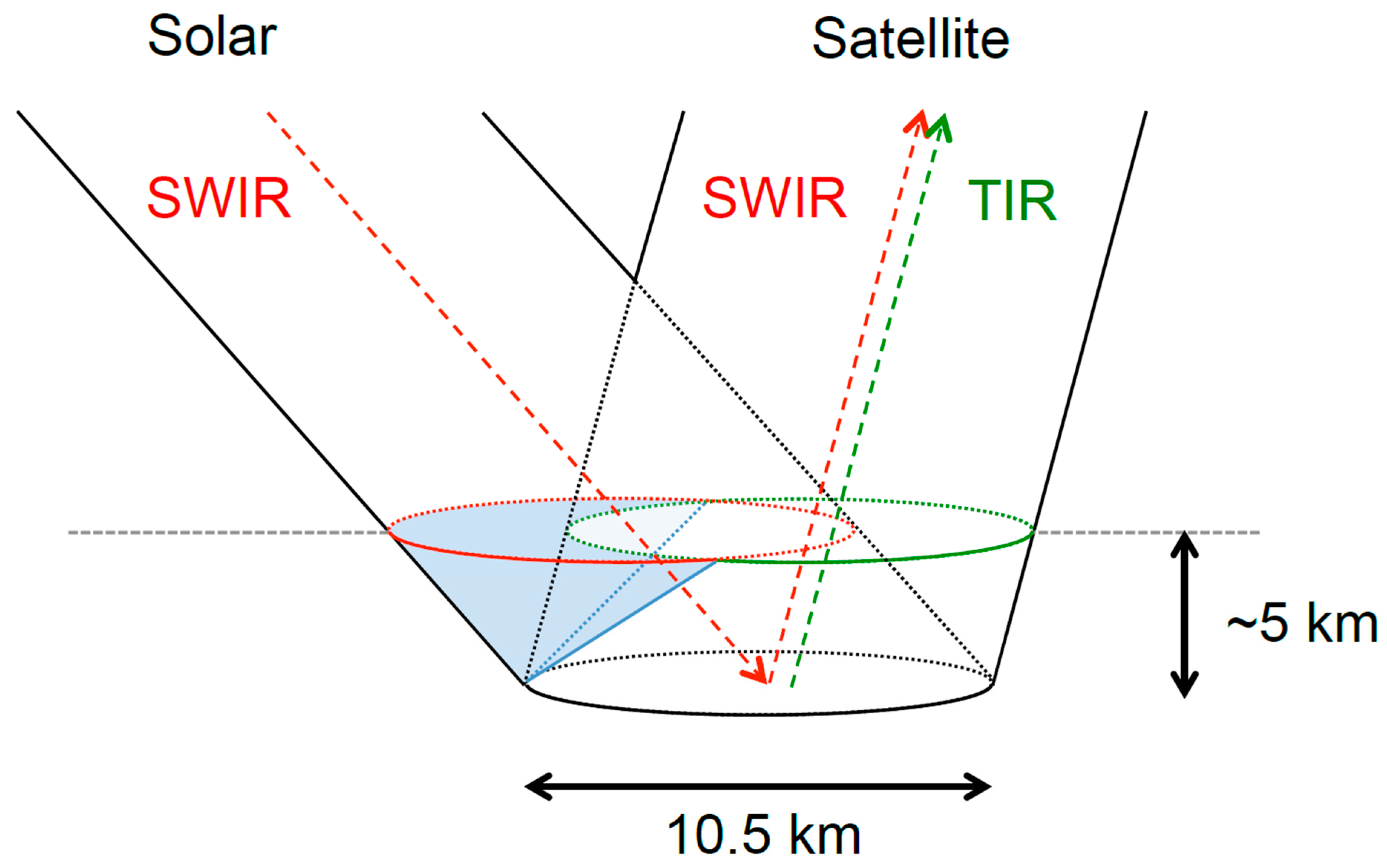 Geometry of TANSO-FTS TIR and SWIR observations. Volume indicated in light blue corresponds to air mass through which only SWIR radiation passes, for a partial column below 5 km. Partial IWV below an altitude of 5 km for a typical H2O profile (e.g., US standard atmosphere) accounts for approximately 90% of the total IWV, and in this figure, the IWV is expedientially assumed to be within 5 km altitude.