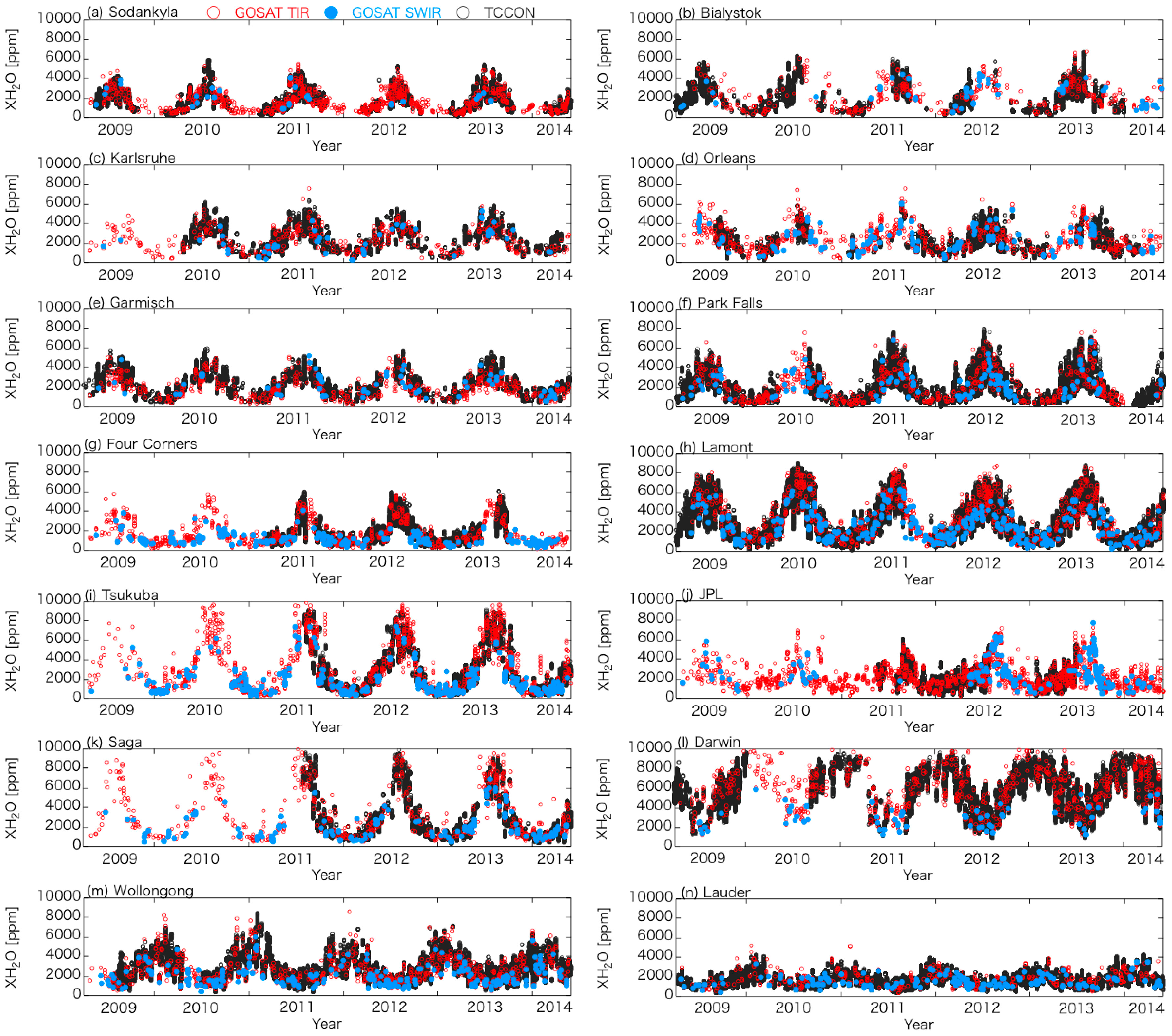 Time series of XH2O derived from TANSO-FTS TIR, TANSO-FTS SWIR, and ground-based FTS measurements around (a) Sodankylä; (b) Białystok; (c) Karlsruhe; (d) Orléans; (e) Garmisch; (f) Park Falls; (g) Four Corners; (h) Lamont; (i) Tsukuba; (j) JPL; (k) Saga; (l) Darwin; (m) Wollongong; and (n) Lauder sites. Black circles indicate the TCCON data, and red and blue circles indicate the TANSO-FTS TIR and SWIR data, respectively. The TANSO-FTS data only above land within 100 km distance from the TCCON site are shown.