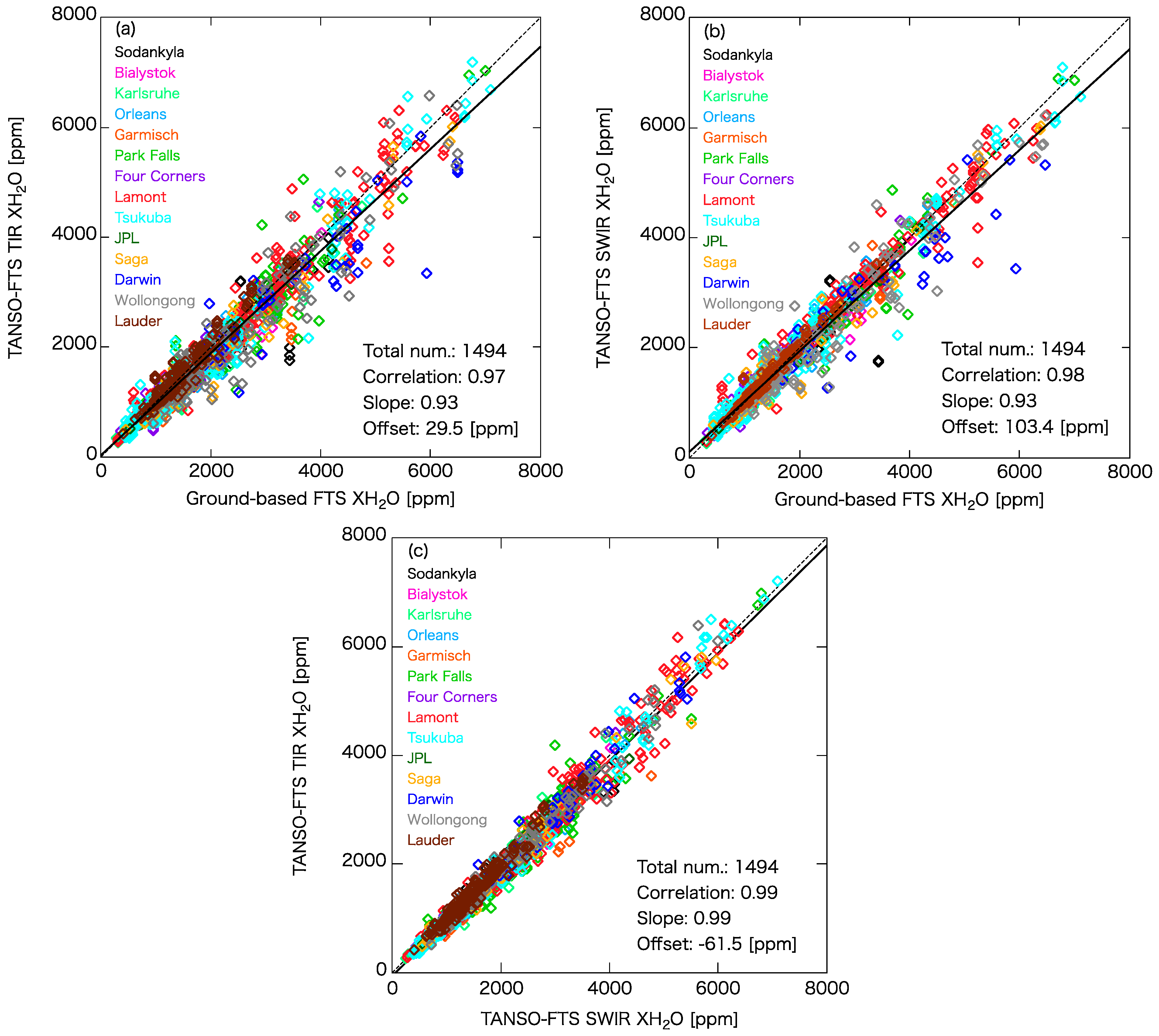 Correlation plots between (a) TANSO-FTS TIR and ground-based FTS XH2O; (b) TANSO-FTS SWIR and ground-based FTS XH2O; and (c) TANSO-FTS TIR and SWIR XH2O. The TANSO-FTS data only over land were used to create these plots. The solid and dashed lines denote the linear fit and one-to-one lines, respectively.