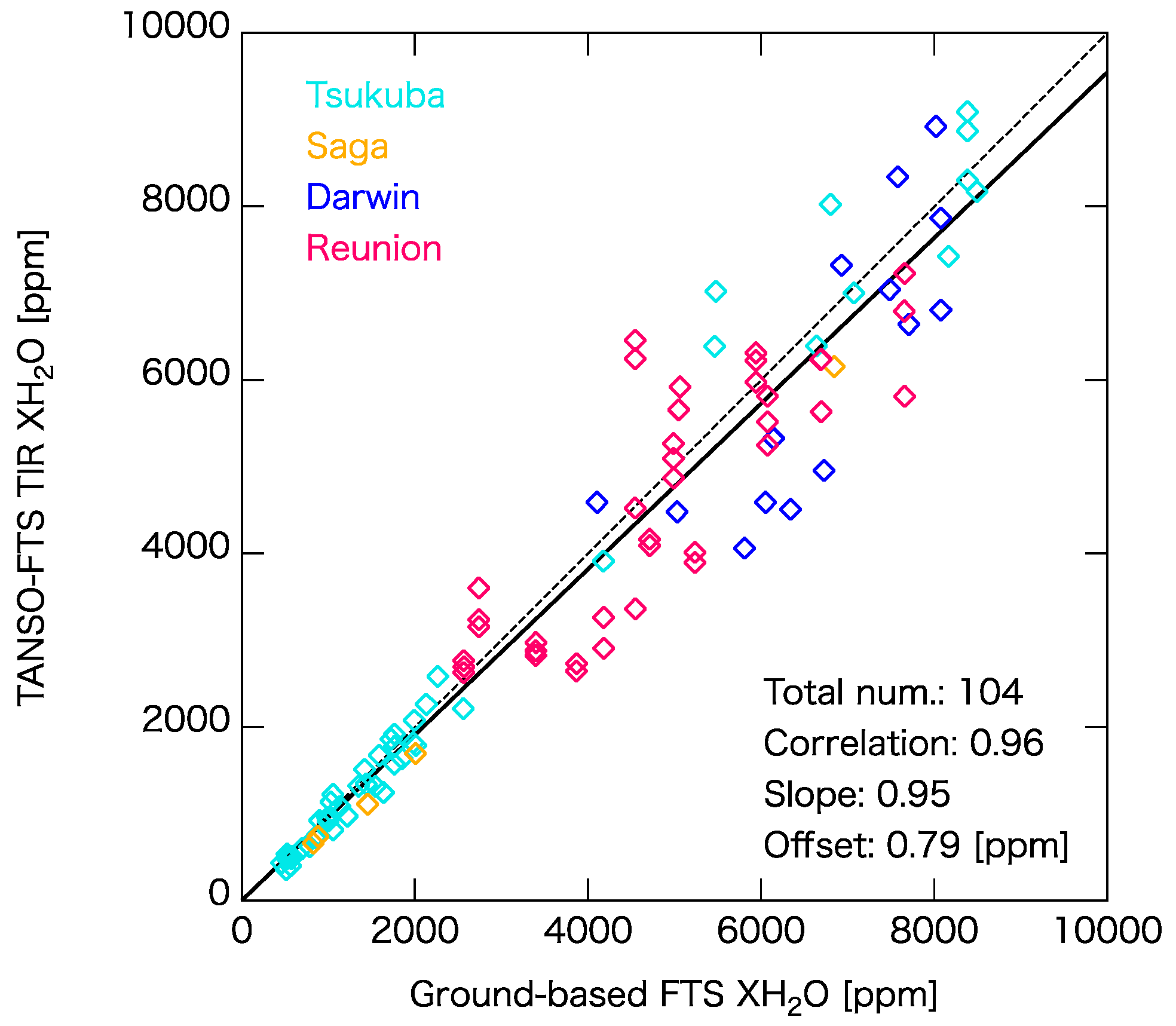 Correlation plot of the TANSO-FTS TIR and ground-based FTS XH2O data. The TANSO-FTS TIR data, which are within a radius of 100 km from the ground-based FTS site and also above ocean, are compared with the ground-based FTS XH2O data measured at Tsukuba, Saga, Darwin, and Réunion sites. The solid and dashed lines denote the linear fit and one-to-one line, respectively.