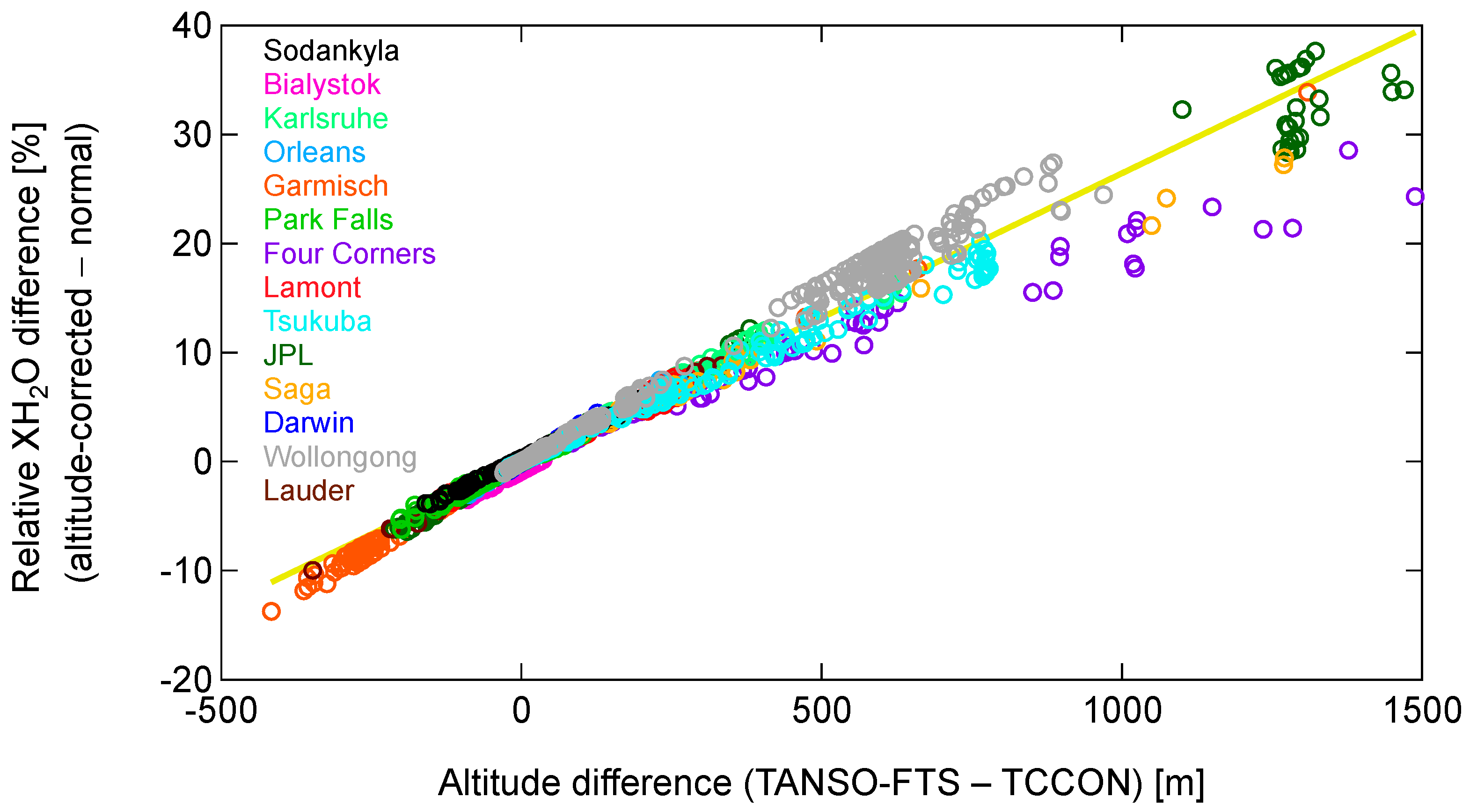 Relative differences between the TANSO-FTS SWIR XH2O data as a function of the difference between the mean altitude within the TANSO-FTS footprints and the TCCON site’s altitude. The difference in the XH2O data was calculated as the difference between the XH2O data with and without the altitude difference corrected. The solid yellow line denotes linear fit with an intercept of zero, and its slope is 0.03%/m.
