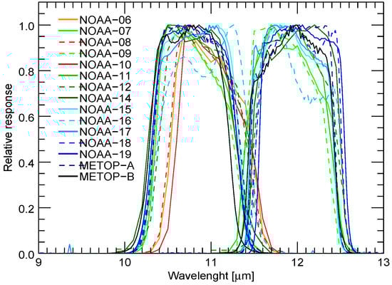 Although the different AVHRR sensors measure in the same bands, their spectral responses are not identical, as each sensor is a unique instrument, which is subject to some form of degradation. The degradation of a sensor and therewith possible overall changes in the spectral responses are accounted for by calibration. However, no information about possible changes in the spectral form is available after lunch [27]. Figure 1 shows the spectral response curves of band 4 and band 5 of the different sensors. The response curves may differ substantially not only between the different models, but also within one model (especially AVHRR/3).