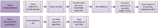 The coefficients for the mono- and the split-window algorithms were all retrieved in the same manner. The first step consists of the selection of profiles from the SeeBor V5 database, as described Section 2. MODTRAN 5.3 was then run using the selected profiles. Thereby, each profile was used multiple times with varying surface characteristics. First of all, the already existing LST values of each profile [28] were tripled as [LST – 5 K, LST, LST + 5 K] to increase the simulated LST variability. Then, the sensor view angle was set to the values [0, 20, 40, 60], the mean band emissivity to values of [0.89, 0.92, 0.96, 0.99] and the difference of the band emissivities to [−0.02, −0.01, 0.00, 0.015]. MODTRAN 5.3 was run for each combination of these values and for each band. Resulting radiances were saved in a database. In a subsequent step, the radiances were convolved over the spectral response of each of the AVHRR sensors and converted to brightness temperatures using Planck’s radiation equation as described in the NOAA Polar Orbiter Data [34] User’s Guide for AVHRR/1 and AVHRR/2 and NOAA KLM User’s Guide for AVHRR/3 [35]. One half of the brightness temperatures were then used together with the associated input LST values for the coefficient estimation of the six split-window equations using least squares minimization. The other half was reserved for accuracy analysis.