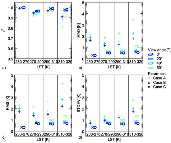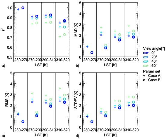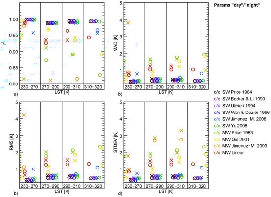 Performance measures (a) r2; (b) MAD; (c) RMS; (d) STDEV of all revised algorithms, separated for different classes of initial guess LST and a columnar water vapour range of 0–35 kg·m−2. Results are retrieved from the case C coefficient set, a sensor view angle of 0°, and daytime (○) and nighttime (×) conditions.