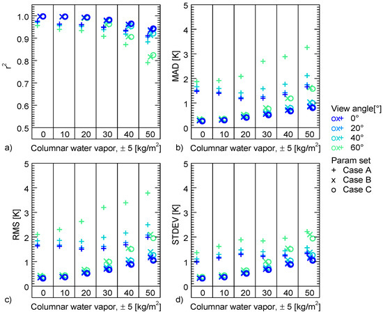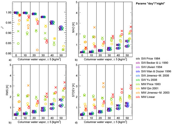Performance measures (a) r2; (b) MAD; (c) RMS; (d) STDEV of all revised algorithms, separated for different classes of CWV and an initial guess LST range from 270 to 310K. Results are retrieved from the case C coefficient set, a sensor view angle of 0°, and daytime (given by symbol ○) and nighttime (given by symbol ×) conditions.