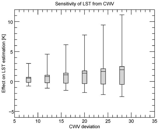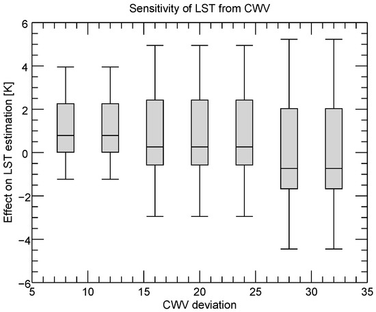 The final accuracy of a product does not only depend on the model performance, but also on the quality of its input data. Considering the fact, that input data to LST estimation is never perfectly accurate, it is straightforward to analyse the sensitivity of each method to its input bands. In this study, sensitivity was evaluated by simple deterministic analysis. The results of an LST algorithm with first a reference input value and second with deviating input values was compared. The differences of the resulting LST from the first reference run and the other (deviating) runs show the sensitivity of an algorithm to that input variable. For this analysis, it is assumed that the deviations have a discrete uniform distribution. Figure 9, Figure 10 and Figure 11 show the sensitivity of the Qin et al., 2001 method to columnar water vapour, emissivity of band 4 and mean atmospheric temperature in form of boxplots for daytime conditions. In case of all input variables, the error increases with increasing deviation of the input variable from its ‘true’ value.