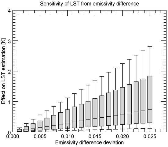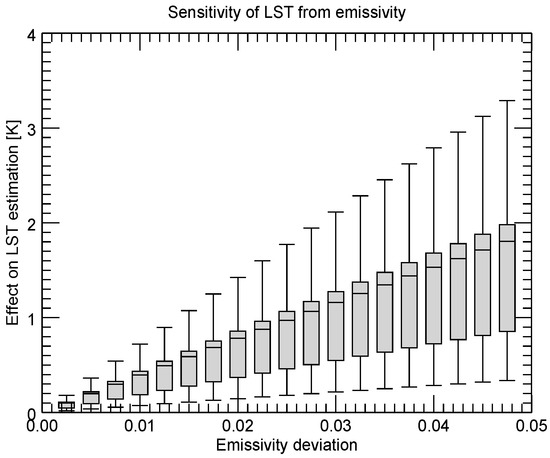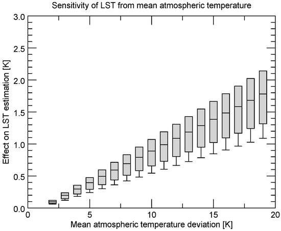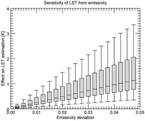 The sensitivity analysis was undertaken by artificially altering the input parameters columnar water vapour, initial guess LST, mean band emissivity, and difference of band emissivity. In case of the columnar water vapour and the initial guess LST, the wrong input values affect the choice of the parameter class and led therefore to a lower accuracy of LST. In case of wrong mean emissivity and wrong differences of band emissivity, the correct parameter classes are chosen, but the algorithm does not foresee such wrong values and therefore renders incorrect LST values. The magnitude of the over- or underestimation of LST is expressed in boxplot figures. Furthermore, total sensitivity is given for each algorithm.