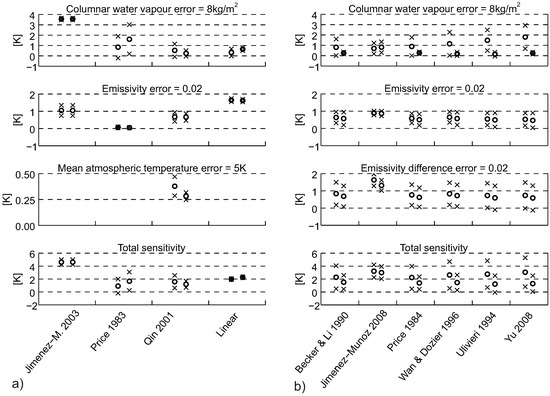 In case all variables are incorrect the errors sum up to a total sensitivity. This is shown at the example of an input error of total water vapour of 8 kg/m2, an emissivity error of 0.02, and—where applicable—an error of mean atmospheric temperature of 5 K and emissivity difference of 0.02. In case of the mono-window algorithms, the algorithms of Price 1983 and Qin et al. 2001 show the lowest total sensitivities. Price 1983 has an almost neglectable sensitivity to emissivity, which is mainly due to the magnitude of the first constant in the formula. Qin et al. 2001 has an extra dependence on mean atmospheric temperature, which increases the total sensitivity between 0.25 K and 0.5 K. In case of the split-window algorithms, all algorithms are in a similar range, except the Jiménez-Muñoz and Sobrino 2008 which shows a higher total sensitivity due to its sensitivity to emissivity and emissivity difference. Figure 15 shows the comparison of the sensitivities of all mono-window and split-window algorithms. Thereby, the error of columnar water vapour was set to 8 kg/m2, the error of mean emissivity, respective band 4 emissivity to 0.02, the error of emissivity difference to 0.02, and finally the error of mean atmospheric temperature to 5 K.