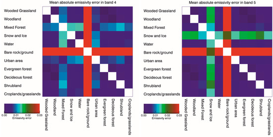 The estimation of emissivity using the VCM method requires a land use classification, which itself is prone to errors (a) due to different definitions of classes by different authors; (b) due to different classification approaches; (c) due to limited classification accuracy; and (d) due to changing surface cover over time [39]. These errors are passed to the emissivity estimation. To estimate the resulting error from misclassification, the absolute difference between the emissivity of one ‘true’ class and the emissivity from other ‘wrong’ classes was calculated for all possible values of FVC (ranging from 0 to 1). The error of a certain misclassification would then be expressed as the MAD. If, for example, a pixel has in reality the class ‘woodland’, but it was misclassified as ‘urban area’, then the MAD would be calculated as the mean of all absolute differences between the ‘true’ woodland emissivities and the ‘wrong’ urban area emissivities for the given range of FVC. Figure 16 shows the errors in emissivity for all classes for band 4 and band 5. Misclassification errors from one vegetated to another vegetated class are generally low (blue color). In addition, the misclassification from a vegetated to an urban class does not substantially change the emissivity. However, the misclassification of the classes ‘bare rock/ground’ do change the emissivity up to 0.06 in band 4 and 0.04 in band 5 (Figure 16 limits the plotted errors to 0.03, to enhance the low error differences). In addition, the class ‘snow and ice’ shows higher values up to 0.02 in band 5.