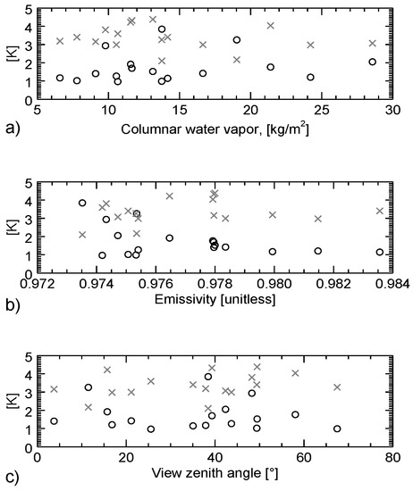MAD per MODIS tile and date in relation to the (a) mean total column water vapour; (b) mean absolute emissivity difference; and (c) mean absolute zenith view angle difference between AVHRR and MODIS. The figures show the MAD resulting from applying the new coefficients (black circles) and the original approach (grey crosses).