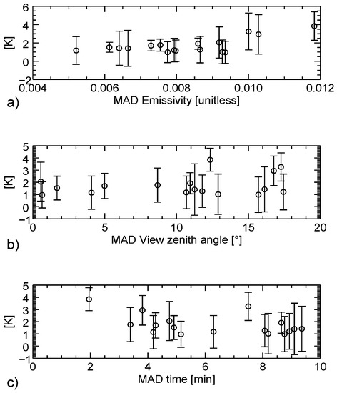 MAD per MODIS tile and date in relation to the (a) mean absolute emissivity difference; (b) mean absolute zenith view angle difference; and (c) mean absolute time difference between AVHRR and MODIS. To each MAD value (circle) the MAD ± the standard deviation is drawn.