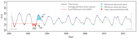 The LML is represented by a horizontal line in the graph of the time series (Figure 2). All EVI2 values that were lower than the LML were considered to represent a dry period. The number of compositions of a crop year in which the EVI2 values were lower than the LML defines the ddp. The area between the time series curve and the LML defines the idp (Figure 2).