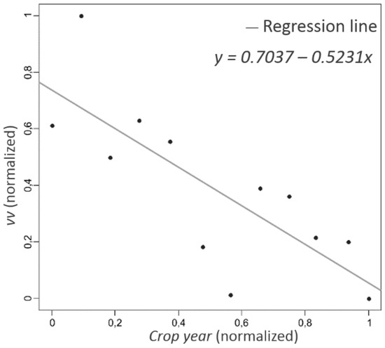 The identification of degradation process was performed using linear regression analysis [45,46]. For every pixel in which no intervention was identified, the 12 calculated values of vv (2000–2012) were taken as observations of a dependent variable, while time (years) was defined as the independent variable. Both variables were normalized between zero and one before fitting the regression line (e.g., Figure 3). Once the assumptions for regression analysis were met [47], a slope test using Student’s t was conducted in order to verify if the regression slope was significant at the 10% level, indicating the occurrence of biological degradation. Figure 3 shows the scatterplot of the normalized values of vv versus time for the 12 analyzed crop years for one of the pixels monitored in the Geodegrade project, with the estimated regression line.