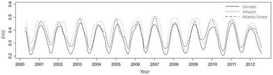 Figure 4 presents the average EVI2 time series for the 267, 389, and 106 samples collected in the Amazon, Cerrado, and Atlantic Forest biomes, respectively. On average, the pastures sampled in the Amazon presented maximum values of EVI2 higher than those sampled in other biomes. It is possible that the difference in maximum values of EVI2 among the three biomes is related not only to soil and climate characteristics, but also to differences in stocking rates, which are generally higher in the Atlantic Forest and the Cerrado [48], directly impacting the availability of forage.