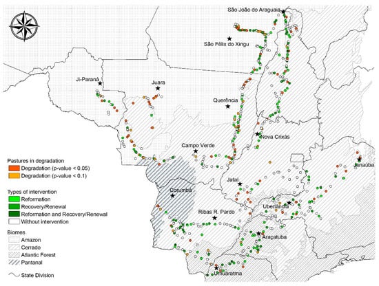 In Midwest Brazil, where the Cerrado biome is predominant, the most direct cause of pasture degradation is the systematic use of stock numbers that exceed the pasture carrying capacity, causing defoliation and loss of soil nutrients, aggravated by the lack of a proper management for pasture recovery [29,54,55]. Overgrazing reduces the vegetation cover and increases the decomposition rates of organic matter and erosion, which are features of biological degradation [12]. For this kind of degradation, the most adopted strategy is the recovery of the soil fertility by manuring, usually performed during the process of reformation.