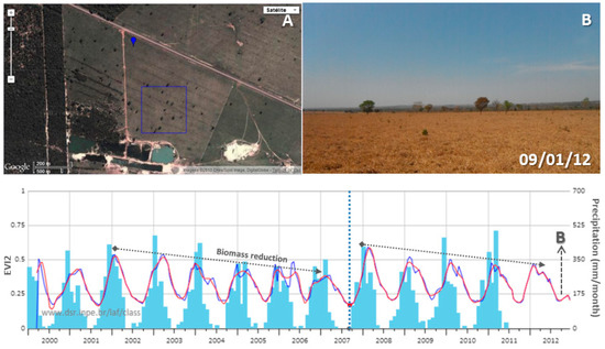 EVI2 time series for a pasture (Brachiaria brizantha) sampled in the Cerrado biome in the State of Mato Grosso (15.87°S, 52.392°W); the stand was classified as “appropriate” in the field: (A) The high-resolution Google Earth Image and (B) The photograph acquired in the field, respectively. The blue line is the first filtered EVI2 time series. The red line is the wavelet transform series. The blue bars are TRMM precipitation time series. The blue dotted line indicates the intervention detected by the protocol. The year label indicates July for each crop-year.