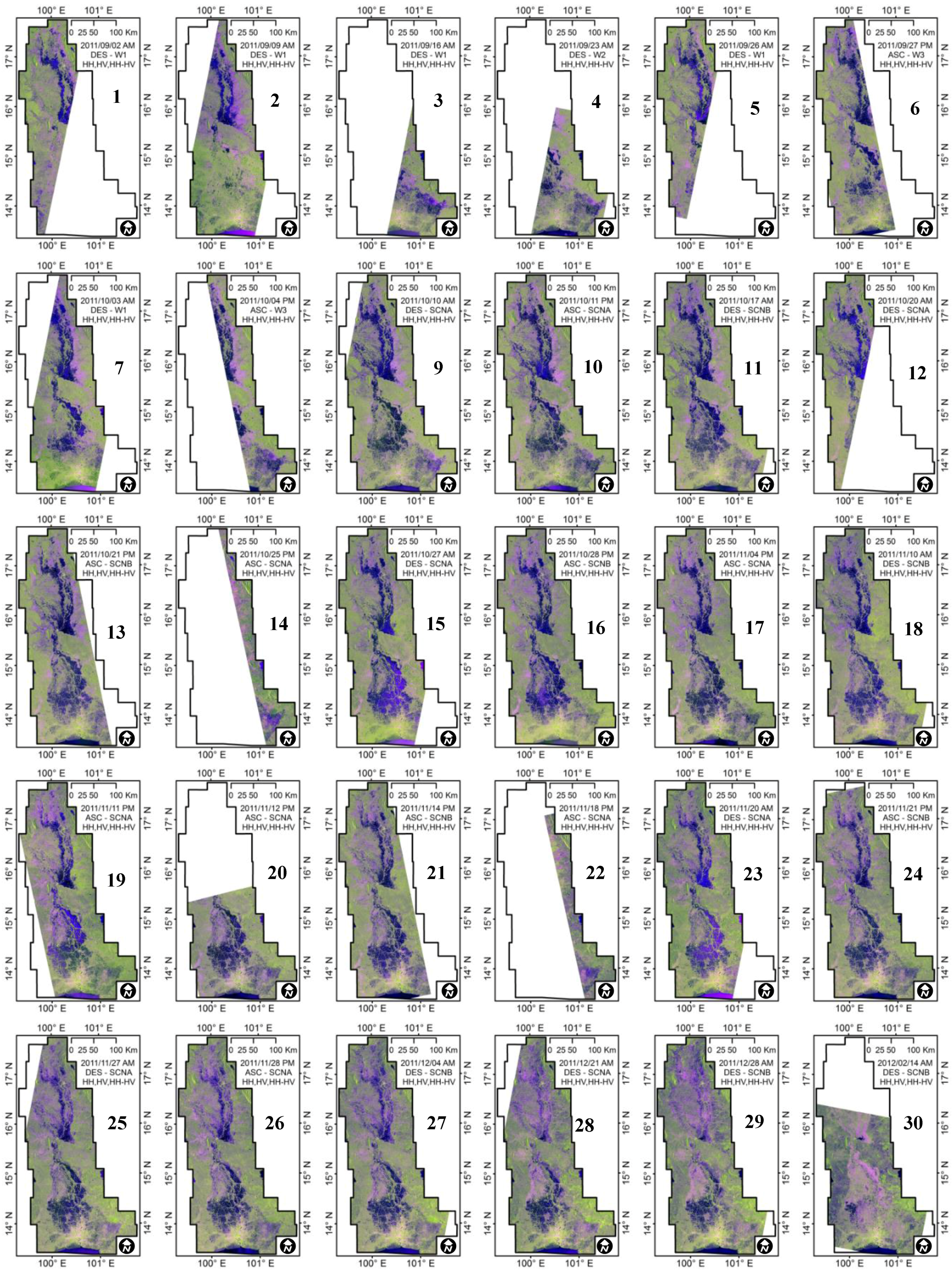 RADARSAT-2 color composite (HH as red, HV as green, and HH/HV as blue) images taken during the 2011 Thai flood event from the beginning to end.