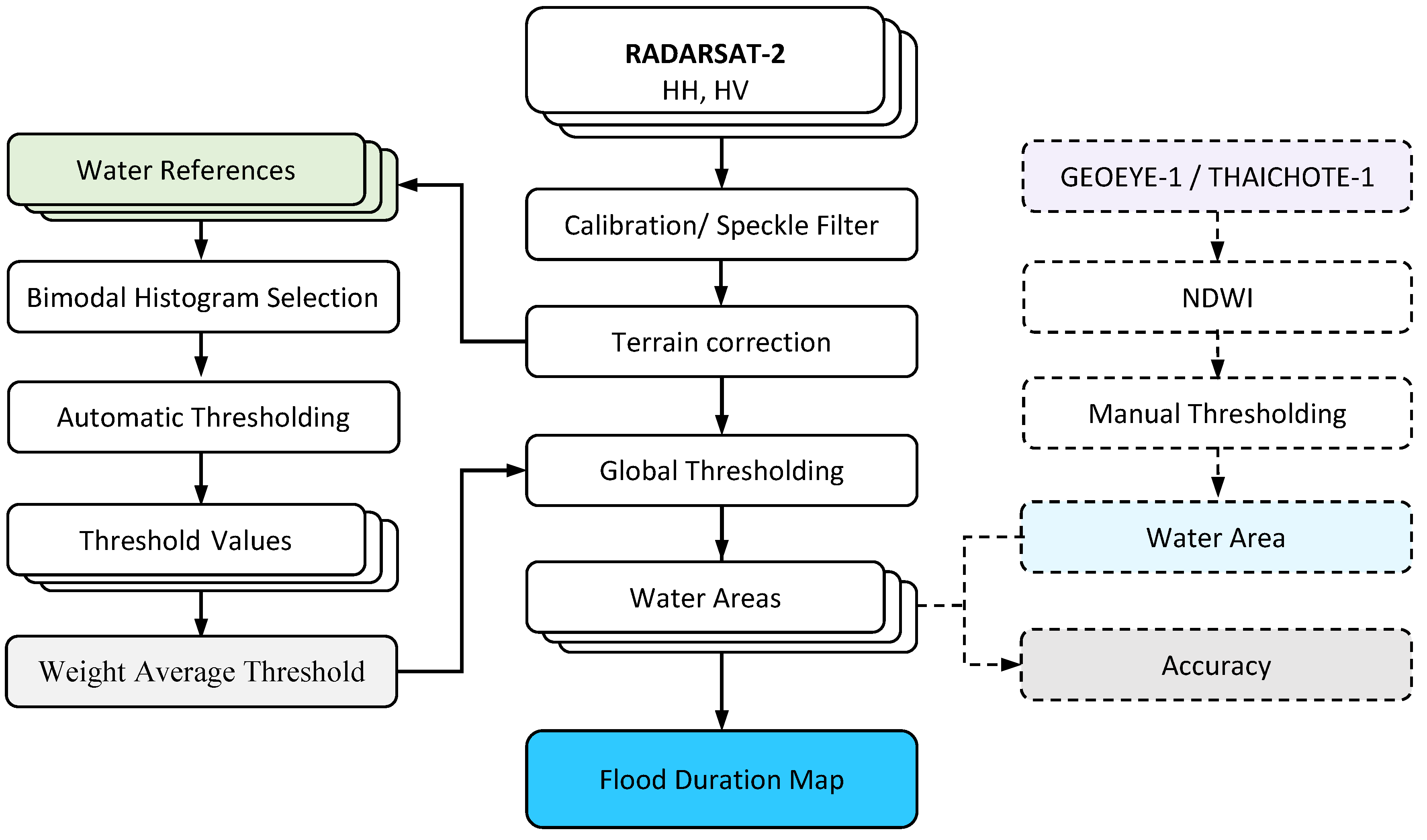 The purpose of the accuracy assessment was to measure the efficiency and accuracy of the final results by comparing the water areas extracted from the SAR images (RS2) with those from the optical images (GE1 and TH1). The backscattering coefficient was used for the SAR images, and the Normalized Difference Water Index (NDWI) was used for the optical images. Although the RS2 images were processed using automatic thresholding, the GE1 image was processed using manual thresholding. The RS2 and TH1 results were compared with the GE1 image to determine the most accurate thresholding. The work flow diagram used in this study is shown in Figure 3.