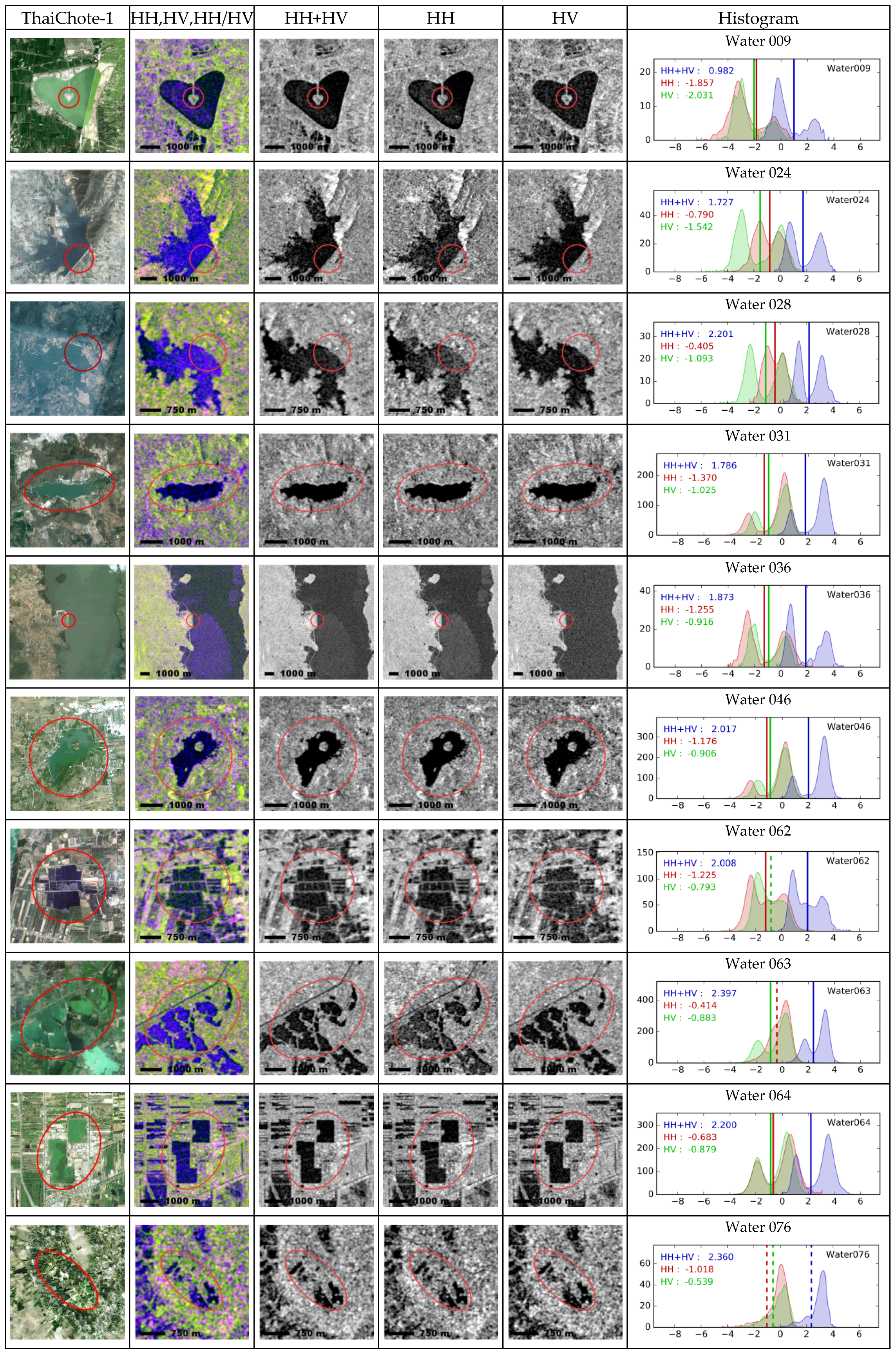 The histogram plots shown in Figure 4 were obtained from the RS2 images and were clipped by the selected water reference within the red elliptical boundary. The blue curve shows the HH+HV backscattering coefficient, the red curve shows the HH backscattering coefficient, and the green curve shows the HV backscattering coefficient. Theoretically, these histograms should display a bimodal distribution, but some of them were found to have unimodal distributions. Examples include water surfaces covered by floating or emerged plants or surface waves caused by strong winds. These situations cause a larger than normal amount of SAR energy to be reflected back to the sensor [11,12,13]. This effect can be observed in the sample images for water references 024, 028, 063, and 076.