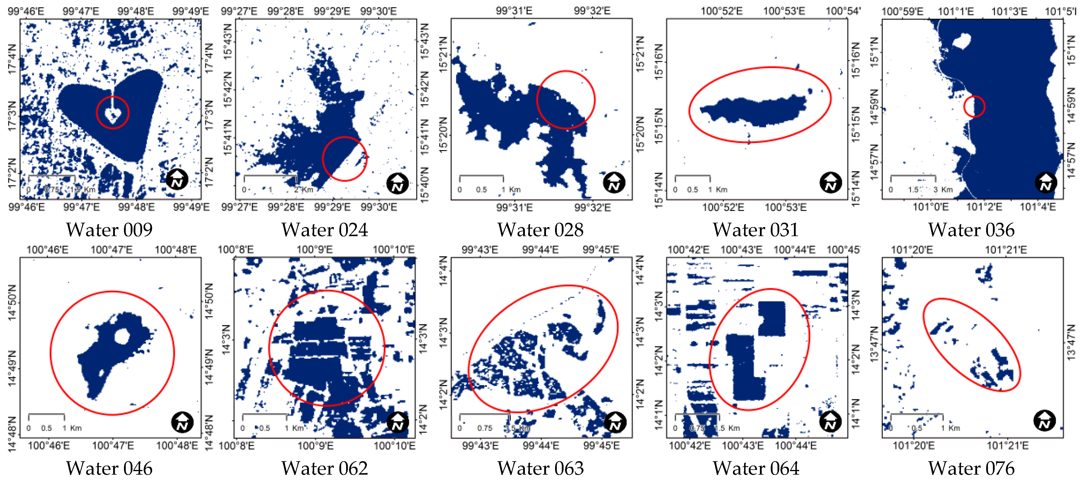 Close-ups of the extracted water extents from the RADARSAT-2 image acquired on 28 November 2011 using the HH + HV global threshold value (1.92 dB). The water areas are displayed in deep blue, and the red ellipses are the water references.