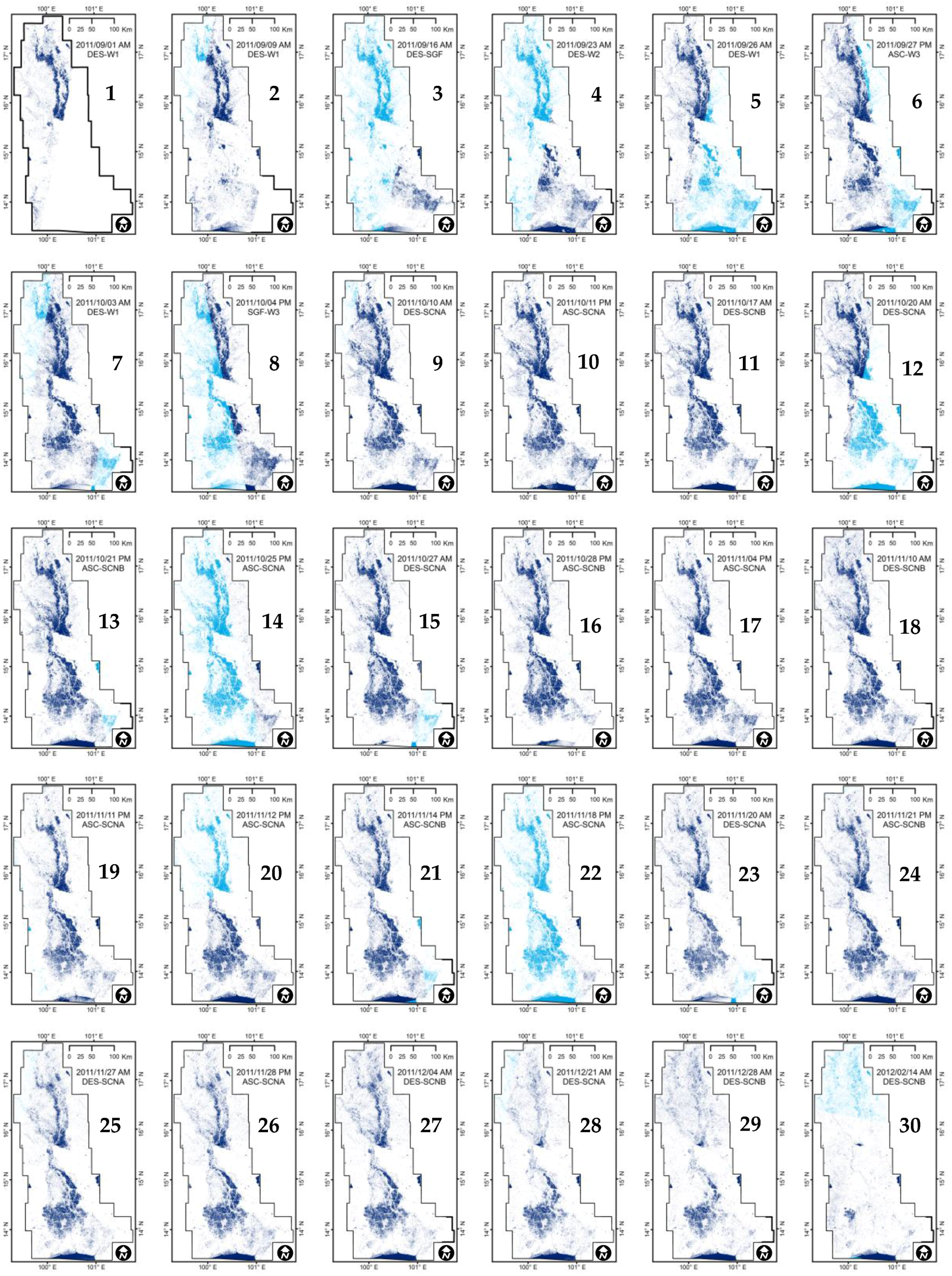 The water areas were simply extracted by applying a global threshold value to each RS2 image. Close-ups of the extracted result from the image acquired on 28 November 2011 are shown in Figure 5. The water boundaries obtained using this technique appear to be reasonable in comparison to the visually classified results from the original RS2 and TH1 images acquired in a dry season. All the RS2 images from the 30 dates were processed separately. Because some RS2 images did not cover the entire study area, the missing parts were estimated from the previous image. The results are shown in Figure 6. The results from the current date are shown in deep blue, and the estimated results from the previous date are shown in light blue. The estimations coincided with the actual flood situation; flooding began in the north region on 2 October 2011 (image 1), the flooded areas spread to the south on 23 October 2011 (image 4), the flood in the north had abated by 21 November 2011 (image 28), and was completely finished on 14 February 2012 (image 30).