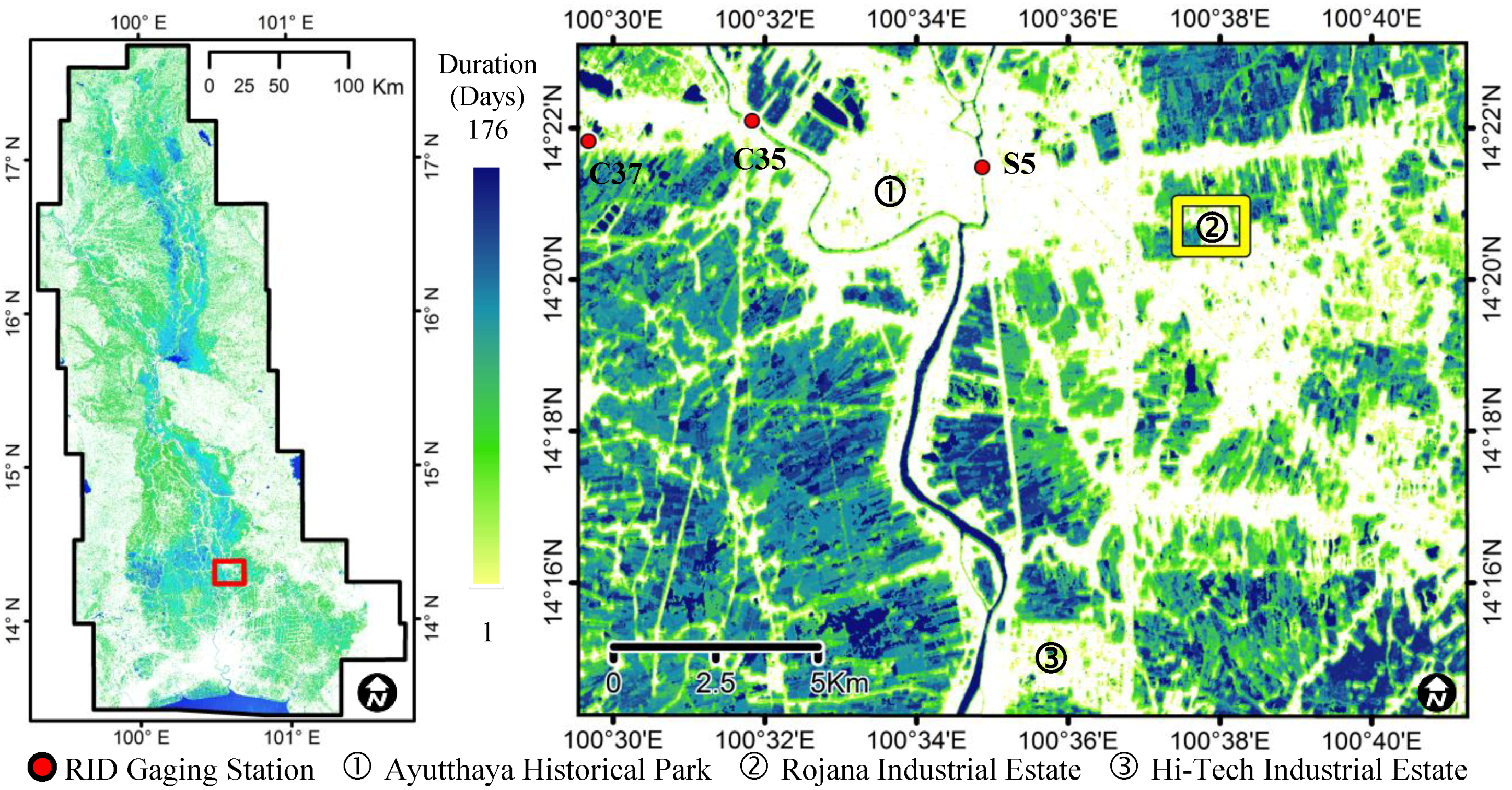 Water duration map calculated by stacking the extracted water surfaces. The red border shows Ayutthaya City, an enlargement of which is shown on the right side of the figure. The yellow border shows the Rojana industrial park.