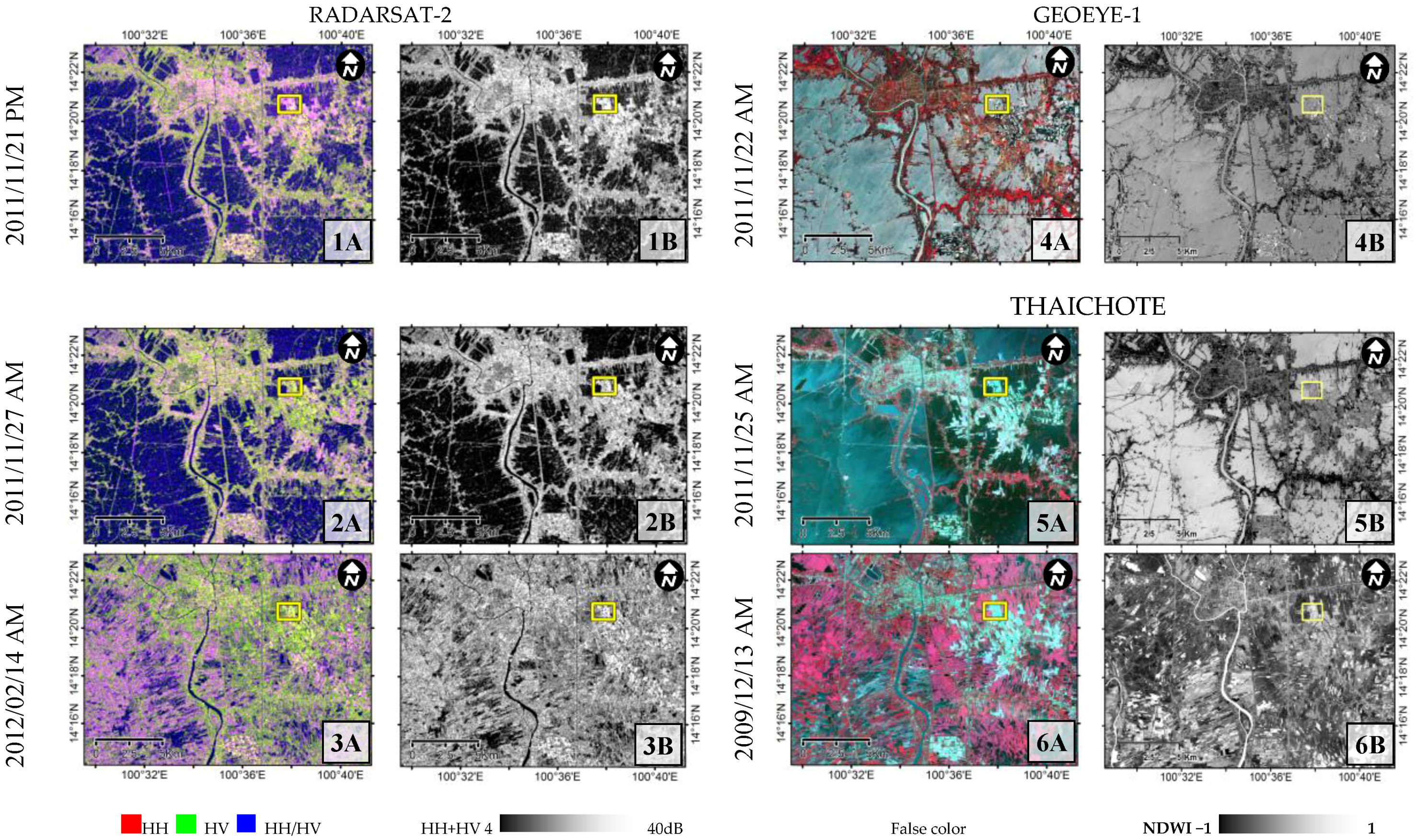 Close-up of Ayutthaya city for in-flood and post-flood time. The dual polarization color composite (1A–3A) and HH + HV (1B–3B) from RADARSAT-2. The false color composite and NDWI (4A, 4B) from GeoEye-1, and the false color composite and NDWI for in-flood (5A, 5B) and pre-flood (6A, 6B) times from ThaiChote-1.