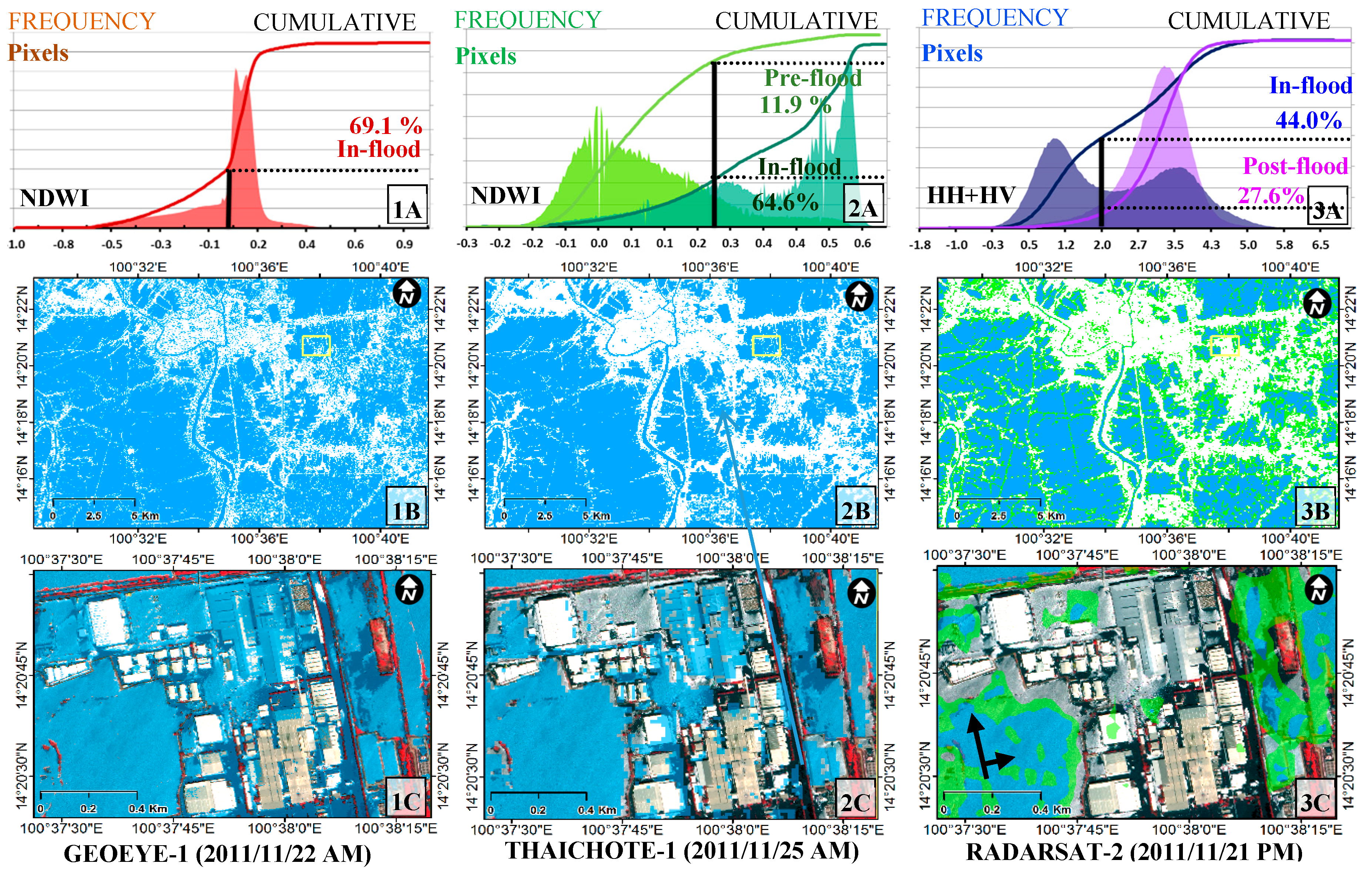 Histograms and cumulative probability plots (top) and extracted flooded areas (blue color) in Ayutthaya city (middle) and over part of the Rojana Industrial Park (bottom), from the visualization of the GeoEye-1 image (1A–1C), determining the best accuracy of the ThaiChote-1 image (2A–2C), and the emphasis of the neighborhood valley on the RADARSAT-2 image (3A–3C), plotted on a GeoEye-1 false color composite. The green pixels are the determined best accuracy results from RADARSAT-2, which was larger than that determined using the neighborhood valley-emphasis method.